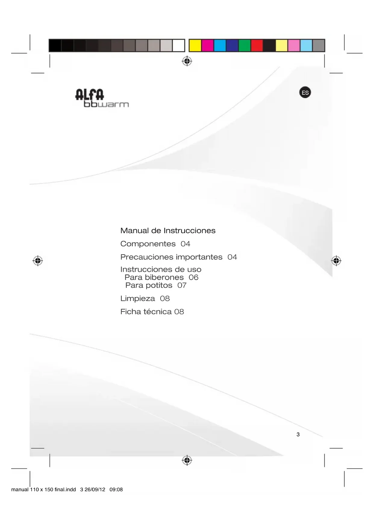 Manual de Instrucciones Componentes 04 Precauciones importantes 04 Instrucciones de uso Para biberones 06 Para potitos 07 Limpieza 08 Ficha técnica 08 manual 110 x 150 final.indd 3 26/09/12 09:084