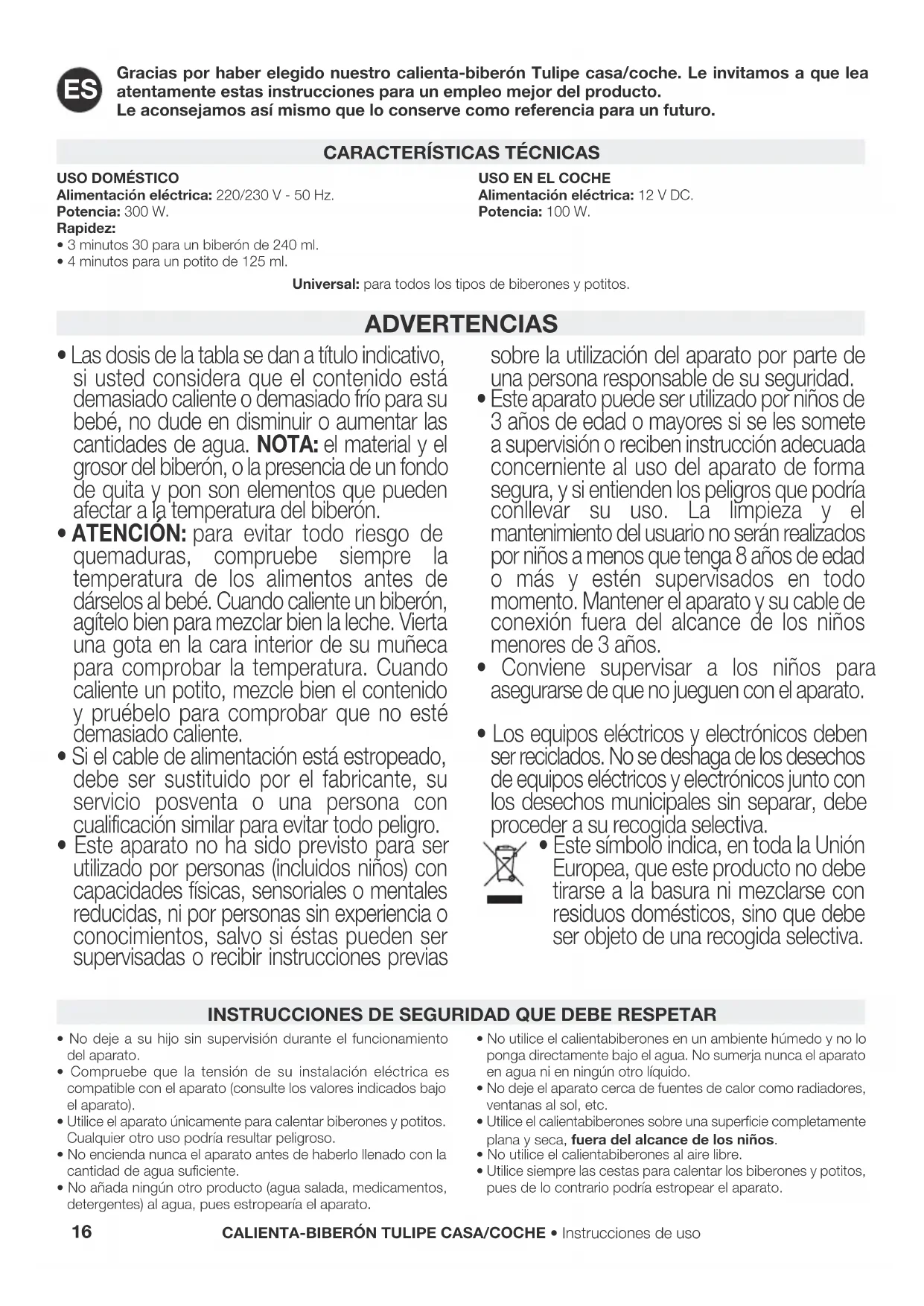 - Este símbolo indica, en toda la Unión Europea, que este producto no debe tirarse a la basura ni mezclarse con residuos domésticos, sino que debe ser objeto de una recogida selectiva. USO DOMÉSTICOAlimentación eléctrica: 220/230 V - 50 Hz.Potencia: 300 W.Rapidez:• 3 minutos 30 para un biberón de 240 ml.• 4 minutos para un potito de 125 ml.USO EN EL COCHEAlimentación eléctrica: 12 V DC.Potencia: 100 W.Universal: para todos los tipos de biberones y potitos. CARACTERÍSTICAS TÉCNICAS• No deje el biberón o el potito calentarse durante demasiado tiempo; eso podría favorecer el desarrollo de microbios en la leche o en la comida.