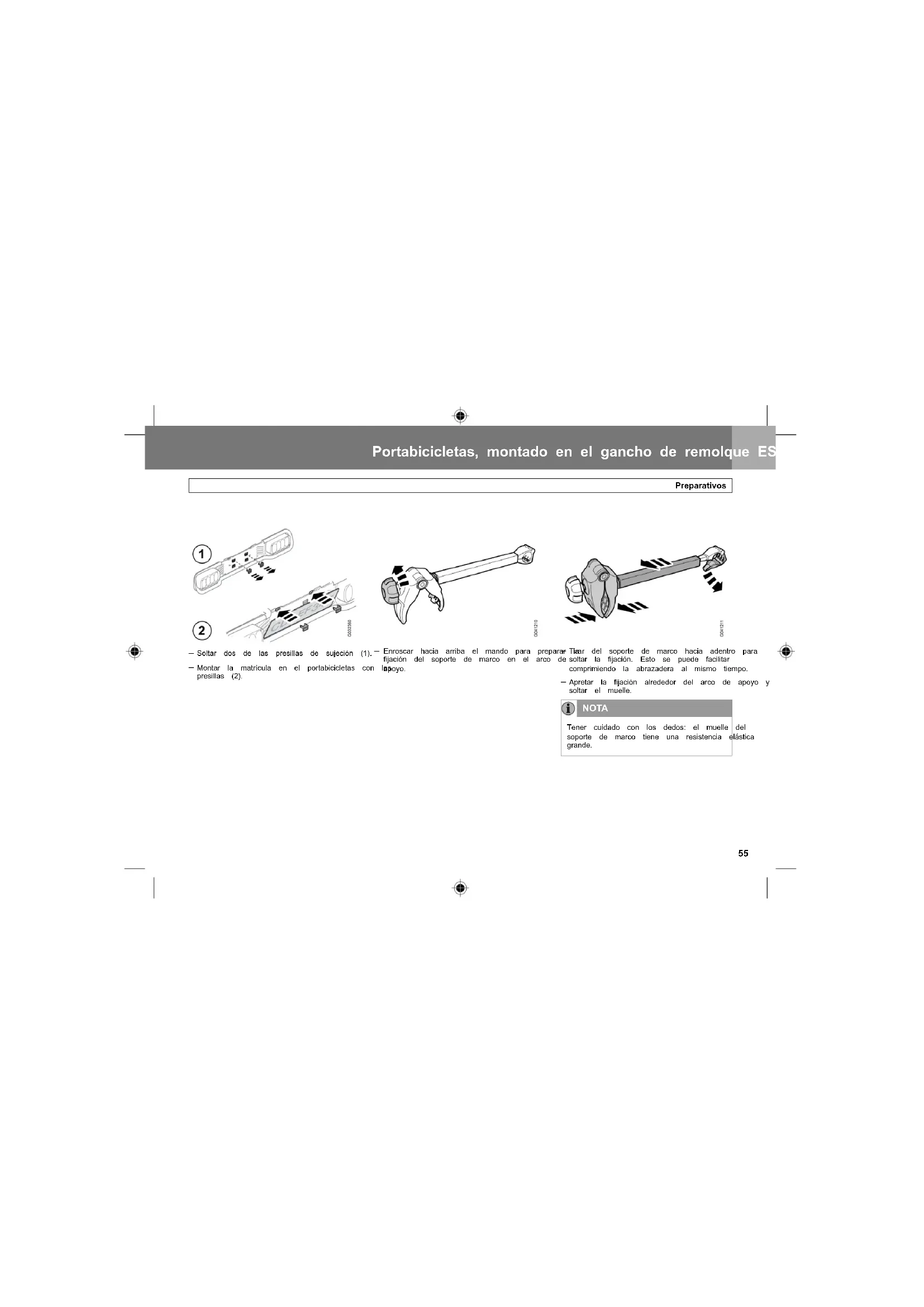 Apretar la fijación alrededor del arco de apoyo y soltar el muelle. NOTA Tener cuidado con los dedos: el muelle del soporte de marco tiene una resistencia elástica grande. Portabicicletas, montado en el gancho de remolque ES Preparativos