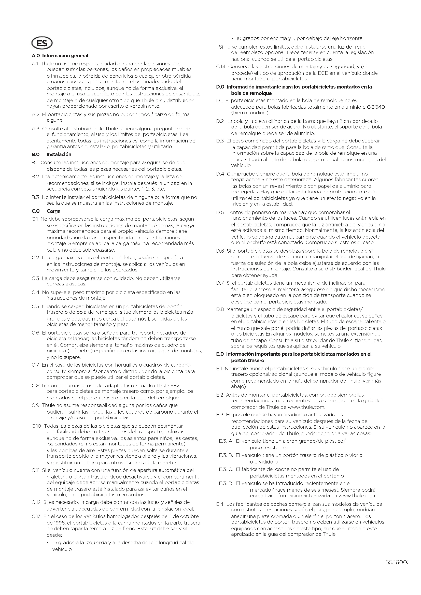 - 10 grados por encima y 5 por debajo del eje horizontal Si no se cumplen estos límites, debe instalarse una luz de freno de reemplazo opcional. Debe tenerse en cuenta la legislación nacional cuando se utilice el portabicicletas. C.14 Conserve las instrucciones de montaje y de seguridad, y (si procede) el tipo de aprobación de la ECE en el vehículo donde tiene montado el portabicicletas. D.0 Información importante para los portabicicletas montados en la bola de remolque D.1 El portabicicletas montado en la bola de remolque no es adecuado para bolas fabricadas totalmente en aluminio o GGG40 (hierro fundido). D.2 La bola y la pieza cilíndrica de la barra que llega 2 cm por debajo de la bola deben ser de acero. No obstante, el soporte de la bola de remolque puede ser de aluminio. D.3 El peso combinado del portabicicletas y la carga no debe superar la capacidad permitida para la bola de remolque. Consulte la información sobre la capacidad de la bola de remolque en una placa situada al lado de la bola o en el manual de instrucciones del vehículo. D.4 Compruebe siempre que la bola de remolque esté limpia, no tenga aceite y no esté deteriorada. Algunos fabricantes cubren las bolas con un revestimiento o con papel de aluminio para protegerlas. Hay que quitar esta funda de protección antes de utilizar el portabicicletas ya que tiene un efecto negativo en la fricción y en la estabilidad. D.5 Antes de ponerse en marcha hay que comprobar el funcionamiento de las luces. Cuando se utilicen luces antiniebla en el portabicicletas, compruebe que la luz antiniebla del vehículo no esté activada al mismo tiempo. Normalmente, la luz antiniebla del vehículo se apaga automáticamente cuando el vehículo detecta que el enchufe está conectado. Compruebe si este es el caso. D.6 Si el portabicicletas se desplaza sobre la bola de remolque o si se reduce la fuerza de sujeción al manipular el asa de fijación, la fuerza de sujeción de la bola debe ajustarse de acuerdo con las instrucciones de montaje. Consulte a su distribuidor local de Thule para obtener ayuda. D.7 Si el portabicicletas tiene un mecanismo de inclinación para facilitar el acceso al maletero, asegúrese de que dicho mecanismo está bien bloqueado en la posición de transporte cuando se desplace con el portabicicletas montado. D.8 Mantenga un espacio de seguridad entre el portabicicletas/ bicicletas y el tubo de escape para evitar que el calor cause daños en el portabicicletas o en las bicicletas. El tubo de escape caliente o el humo que sale por él podría dañar las piezas del portabicicletas o las bicicletas En algunos modelos, se necesita una extensión del tubo de escape. Consulte a su distribuidor de Thule si tiene dudas sobre los requisitos que se aplican a su vehículo. E.0 Información importante para los portabicicletas montados en el portón trasero E.1 No instale nunca el portabicicletas si su vehículo tiene un alerón trasero opcional/adicional (aunque el modelo de vehículo figure como recomendado en la guía del comprador de Thule, ver más abajo). E.2 Antes de montar el portabicicletas, compruebe siempre las recomendaciones más frecuentes para su vehículo en la guía del comprador de Thule de www.thule.com. E.3 Es posible que se hayan añadido o actualizado las recomendaciones para su vehículo después de la fecha de publicación de estas instrucciones. Si su vehículo no aparece en la guía del comprador de Thule, puede deberse a varias cosas: E.3. A. El vehículo tiene un alerón grande/de plástico/ poco resistente o E.3. B. El vehículo tiene un portón trasero de plástico o vidrio, odividido o E.3. C. El fabricante del coche no permite el uso de portabicicletas montados en el portón o E.3. D. El vehículo se ha introducido recientemente en el mercado (hace menos de seis meses). Siempre podrá encontrar información actualizada en www.thule.com. E.4 Los fabricantes de coches comercializan sus modelos de vehículos con distintas prestaciones según el país; por ejemplo, podrían añadir una pieza cromada o un alerón al portón trasero. Los portabicicletas de portón trasero no deben utilizarse en vehículos equipados con accesorios de este tipo, aunque el modelo esté aprobado en la guía del comprador de Thule.6 5560032001 E.5 Thule no asume responsabilidad alguna por los daños o pérdidas causados por la falta de información o la existencia de datos no actualizados en la guía del comprador de Thule como resultado de las diferencias regionales en las prestaciones de los vehículos. E.6 Tenga en cuenta que si se instala un portabicicletas de portón trasero quizás no se pueda utilizar el limpiaparabrisas del portón. Habrá que desactivar la función de limpiaparabrisas (por ejemplo, quitando el fusible; compruebe el manual de instrucciones delvehículo) o quitar el limpiaparabrisas. En los vehículos con funcionamiento automático del limpiaparabrisas trasero, hay que desconectar esta función cuando se instale un portabicicletas de portón trasero. Consulte al concesionario o al taller para obtener ayuda. E.7 Limpie siempre la superficie y los bordes del portón trasero antes de montar el portabicicletas de portón trasero. E.8 Debido al riesgo existente de dañar el vehículo, no está permitida la apertura del maletero si el portabicicletas de portón trasero está montando con las bicicletas. Antes de abrir el maletero, debe haberse descargado el portabicicletas. F.0 Normativas y características de conducción F.1 Compruebe con regularidad las sujeciones de la carga. F.2 El conductor del vehículo es el único responsable de comprobar que el portabicicletas está en buen estado y que tanto el portabicicletas como la carga están debidamente sujetos (aunque lo haya montado una tercera persona). F.3 Cada vez que utilice el portabicicletas, compruebe que está bien sujeto tras conducir una distancia corta (50 km) y a intervalos periódicos a partir de entonces. Si nota algún ruido fuera de lo norm