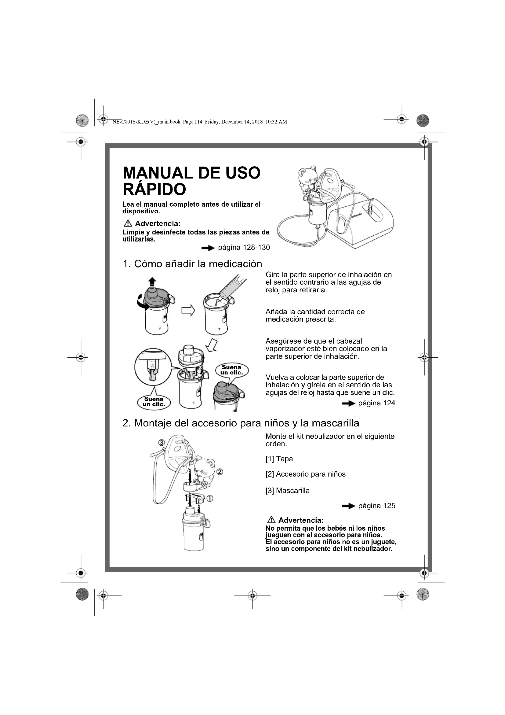 NE-C801S-KDE(V)_main.book Page 113 Friday, December 14, 2018 10:32 AMMANUAL DE USO RÁPIDO Lea el manual completo antes de utilizar el dispositivo. Advertencia: Limpie y desinfecte todas las piezas antes de utilizarlas. página 128-130