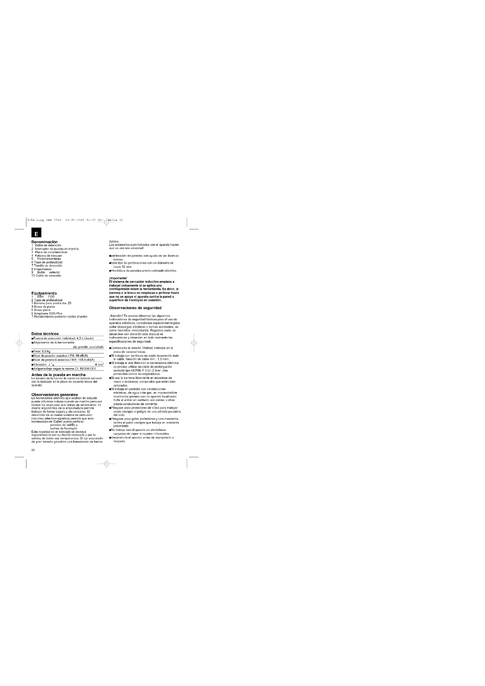 Antiparasitaje según la norma CE 89/336/CEE Antes de la puesta en marcha La tensión de la fuente de corriente deberá coincidir con lo indicado en la placa de caracter’sticas del aparato. Observaciones generales La barrenadora eléctrica que acaban de adquirir puede utilizarse incluso cuando un martillo percusor normal ha alcanzado sus límites de rendimiento. El diseño ergonómico de la empuñadura permite trabajar de forma segura y sin cansarse. El desarrollo de un nuevo sistema de percusión inductiva (electromagnética) permite que esta barrenadora de Einhell pueda perforar: paredes de ladrillo y techos de hormigón. Esta novedad en el mercado se destaca especialmente por su diseño compacto y por la solidez de todos sus componentes. El eje acanalado de gran tamaño garantiza una transmisión de fuerza óptima. Los accesorios suministrados con el aparato hacen que su uso sea universal: perforación de paredes con ayuda de las diversas brocas. todo tipo de perforaciones con un diámetro de hasta 32 mm. Hendidura de paredes previo cableado eléctrico. ¡Importante! El sistema de percusión inductivo empieza a trabajar únicamente si se aplica una contrapresión sobre la herramienta. Es decir, la barrena o la broca no empiezan a perforar hasta que no se apoye el aparato contra la pared o superficie de hormigón en cuestión. Observaciones de seguridad ¡Atención! Es preciso observar las siguientes instrucciones de seguridad básicas para el uso de aparatos eléctricos, concebidas especialmente para evitar descargas eléctricas y demás accidentes, as’ como incendios involuntarios. Rogamos pués, se sirvan leer con atención este manual de instrucciones y observen en todo momento las especificaciones de seguridad. Compruebe la tensión (Voltios) indicada en la placa de caracter’sticas. Si trabaja con tambores de cable desenrrolle todo el cable. Sección de cable mín.: 1,0 mm