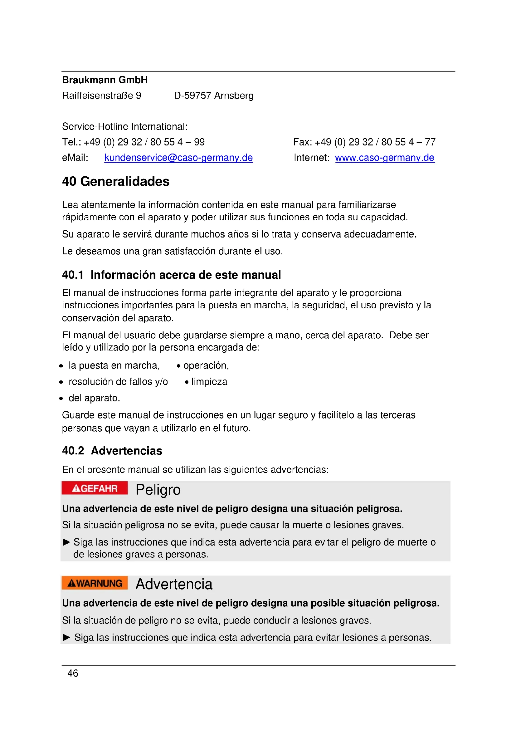 Esta documentación está protegida por los derechos de autor. Braukmann GmbH se reserva todos los derechos, incluida la reproducción fotomecánica, la publicación y distribución mediante procedimientos especiales (p.ej. procesamiento de datos, soporte de datos y redes de datos), ya sea en su totalidad o en parte. Válido salvo errores de contenido y modificaciones técnicas 41 Seguridad En este capítulo obtendrá importantes instrucciones de seguridad sobre la manipulación del aparato. Este aparato cumple la normativa de seguridad vigente. No obstante, el uso indebido puede causar lesiones a personas y daños materiales.48