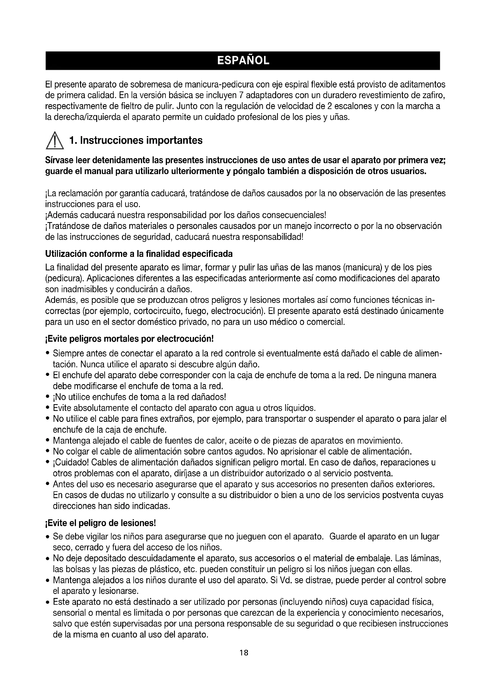 Sírvase leer detenidamente las presentes instrucciones de uso antes de usar el aparato por primera vez; guarde el manual para utilizarlo ulteriormente y póngalo también a disposición de otros usuarios. ¡La reclamación por garantía caducará, tratándose de daños causados por la no observación de las presentes instrucciones para el uso. ¡Además caducará nuestra responsabilidad por los daños consecuenciales! ¡Tratándose de daños materiales o personales causados por un manejo incorrecto o por la no observación de las instrucciones de seguridad, caducará nuestra responsabilidad! Utilización conforme a la finalidad especificada La finalidad del presente aparato es limar, formar y pulir las uñas de las manos (manicura) y de los pies (pedicura). Aplicaciones diferentes a las especificadas anteriormente así como modificaciones del aparato son inadmisibles y conducirán a daños. Además, es posible que se produzcan otros peligros y lesiones mortales así como funciones técnicas in- correctas (por ejemplo, cortocircuito, fuego, electrocución). El presente aparato está destinado únicamente para un uso en el sector doméstico privado, no para un uso médico o comercial. ¡Evite peligros mortales por electrocución!