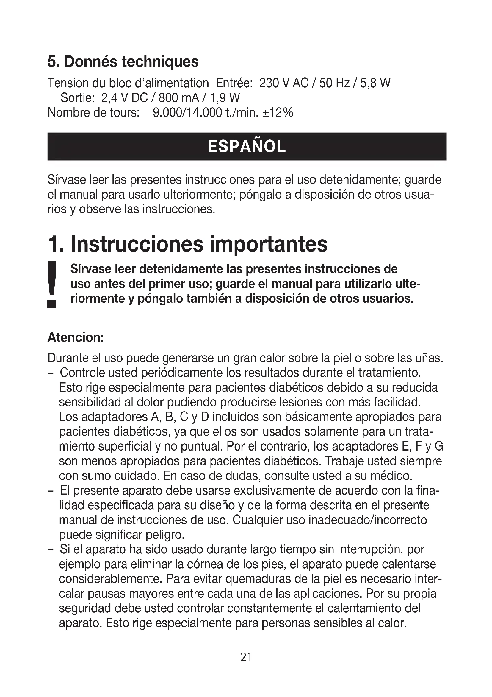 Sírvase leer detenidamente las presentes instrucciones de uso antes del primer uso; guarde el manual para utilizarlo ulte-riormente y póngalo también a disposición de otros usuarios. Atencion: Durante el uso puede generarse un gran calor sobre la piel o sobre las uñas. – Controle usted periódicamente los resultados durante el tratamiento. Esto rige especialmente para pacientes diabéticos debido a su reducida sensibilidad al dolor pudiendo producirse lesiones con más facilidad. Los adaptadores A, B, C y D incluidos son básicamente apropiados para pacientes diabéticos, ya que ellos son usados solamente para un trata-miento superficial y no puntual. Por el contrario, los adaptadores E, F y G son menos apropiados para pacientes diabéticos. Trabaje usted siempre con sumo cuidado. En caso de dudas, consulte usted a su médico.– El presente aparato debe usarse exclusivamente de acuerdo con la fina-lidad especificada para su diseño y de la forma descrita en el presente manual de instrucciones de uso. Cualquier uso inadecuado/incorrecto puede significar peligro.– Si el aparato ha sido usado durante largo tiempo sin interrupción, por ejemplo para eliminar la córnea de los pies, el aparato puede calentarse considerablemente. Para evitar quemaduras de la piel es necesario inter-calar pausas mayores entre cada una de las aplicaciones. Por su propia seguridad debe usted controlar constantemente el calentamiento del aparato. Esto rige especialmente para personas sensibles al calor. ESPAÑOL !22 – El presente equipo está destinado únicamente para la aplicación propia, no habiéndose previsto para su uso médico o comercial. – Por motivos de higiene, el aparato sólo se debe utilizar para una persona. – El fabricante rechazará toda responsabilidad por daños y perjuicios causados por un uso inadecuado o incorrecto. – Antes del uso es necesario asegurarse que el aparato y sus accesori- os no presenten daños exteriores. En casos de dudas no utilizarlos y consulte a su distribuidor o bien a uno de los servicios postventa cuyas direcciones han sido indicadas. – Mantener el material de embalaje fuera del alcance de los niños. Hay riesgo de asfixia. – Controlar con frecuencia si el aparato presenta sintomas de desgaste o daños. Si presentase signos de deterioro, o si el aparato hubiera sido uti- lizado incorrectamente, éste debe ser enviado al fabricante o distribuidor antes seguir utilizándolo. – En caso de presentar defectos y fallas de función, desconectar inmedia- tamente el aparato. – Los trabajos de reparación deben ser llevados a cabo exclusivamente por el servicio postventa o por distribuidores autorizados. – ¡Nunca trate usted mismo de reparar el aparato! – Utilice usted el aparato únicamente con las piezas accesorias adjuntas. – Nunca utilizar el aparato sin vigilancia, especialmente si se encuentran niños en la cercanía. – Niños, personas desvalidas o minusválidas deberán utilizar el aparato siempre bajo la vigilancia de personas adultas o bien deberán ser familia- rizadas preliminarmente con el manejo del aparato. – Nunca aplicar el aparato para el masaje de animales, ya sean pequeños o grandes. – Evitar que el aparato entre en contacto con agua (excepto durante la limpieza con un paño ligeramente humedecido). Nunca debe penetrar agua al interior del aparato. Nunca sumergir el aparato en agua. Nunca utilizar el aparato en la bañera, bajo la ducha, en la piscina o sobre un lavatorio lleno de agua. Si a pesar de todo penetrara agua a la carcasa, desconecte inmediatamente el aparato de la red de corriente eléctrica y consulta usted a su proveedor especializado de artículos eléctricos o al servicio postventa. – Mantener el aparato alejado de fuentes de calor. – Nunca usar el aparato bajo frazadas o almohadas, etc.23 – El aparato no debe ser usado más de 30 minutos sin interrupción. Después de este intervalo de tiempo debe intercalarse una pausa de por lo menos 15 minutos para prevenir un sobrecalentamiento del motor. – Antes de cualquier uso del aparato y de la fuente de alimentación en- chufable es necesario secarse completamente las manos. – Nunca jalar del cable de alimentación o del aparato con el fin de desen- chufar la fuente de alimentación de la caja de enchufe. – La fuente de alimentación enchufable puede trabajar solamente con la tensión de red indicada sobre ella. – El aparato debe ser usado solamente con la fuente de alimentación en- chufable incluida. – Desenchufar siempre la fuente de alimentación después de usar el apara- to y antes de limpiarlo o de cambiar las piezas accesorias. – Sírvase eliminar el aparato de acuerdo con la Prescripción para la Eliminación de Aparatos Eléctricos y Electrónicos en Desuso 2002/96/EC-WEEE („Waste Electrical and Electronic Equipment“). En caso de dudas o consultas sírvase dirigirse a las autoridades competentes para la eliminación de desechos.