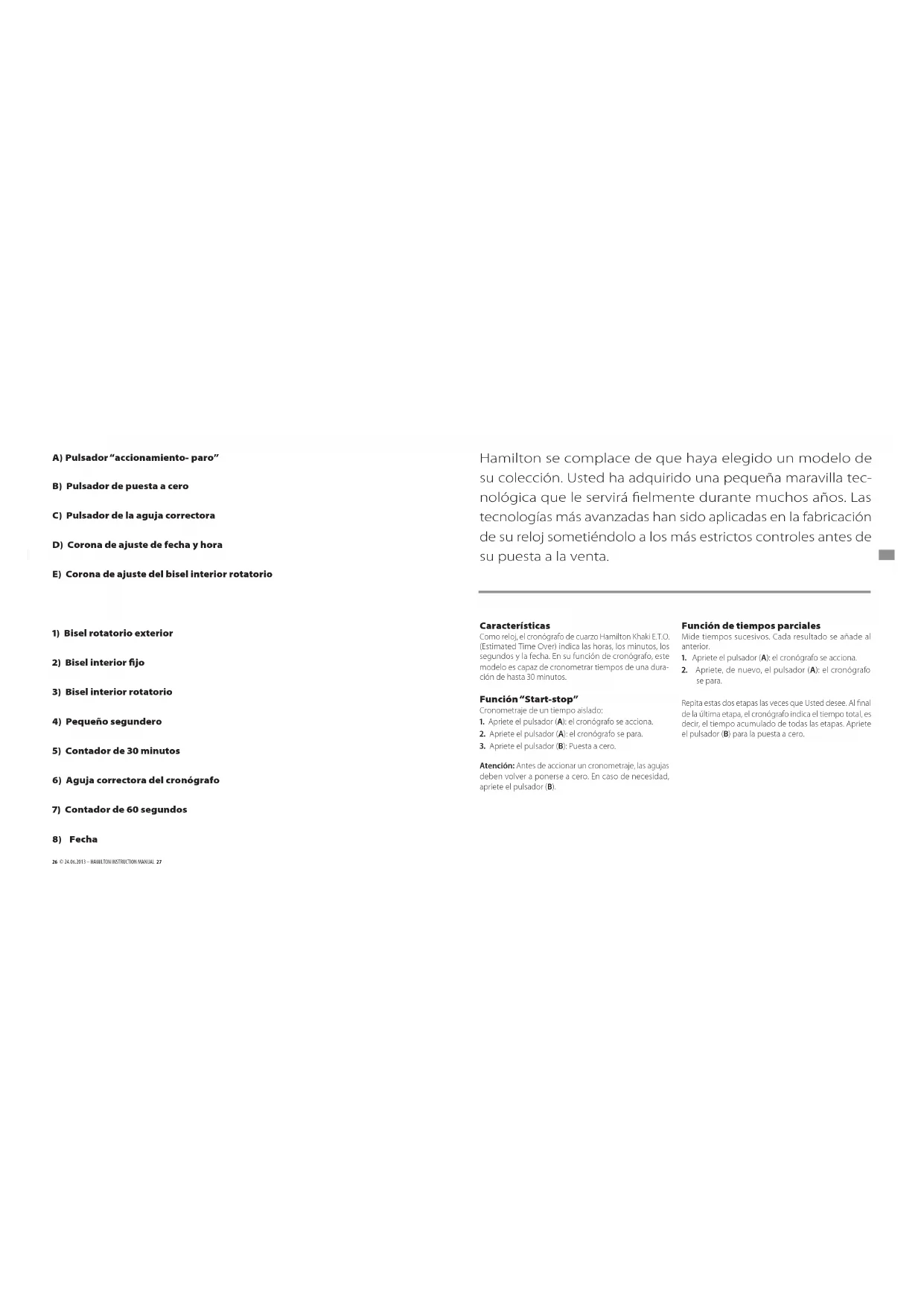 cha roja, el valor de la velocidad = 17,5 millas/hora. Cambio del huso horario y fecha Con la corona (D) situada en posición intermedia (1), Usted puede avanzar o retroceder la aguja de las horas sin inuenciar en la instalación de las agujas del minutero y del segundero. La corrección de la fecha a cada paso de la aguja de las horas se produce a medianoche. Nota: Las coronas (D) y (E) están atornilladas con el n de garantizar una estanqueidad óptima. Para acceder a sus correspondientes funciones es necesario destornillar las coronas. Asegúrese de que vuelve a atornillarlas antes de usarlas de nuevo. Ajuste de la hora Cuando la corona (D) se encuentra en posición (2), todas las agujas – horas, minutos y segundos – se detienen y pueden ser desplazadas para el ajuste horario. Reajuste del cronógrafo (Si las agujas no se encuentran exactamente sobre el cero) Cuando una aguja del cronógrafo gira, apriete el pulsa- dor (A) con el n de detener el cronógrafo y apriete el pulsador (B): las agujas vuelen a la posición inicial. En caso de que las agujas no volvieran exactamente al cero, cada una de ellas puede volver a ponerse sobre cero de la siguiente forma: Contador de 30 minutos Corona (D) en posición 1: apriete el pulsador (A). Contador 60 segundos (Aguja blanca – correctora) Con la corona (D) en posición 2: apriete el pulsador (A). Contador 60 segundos (Aguja roja – segundero) Con la corona (D) en posición 2: apriete el pulsador (B) Nota: Al mantener la presión sobre el pulsador durante más de un segundo, puede hacer que las agujas avancen con mayor rapidez. Importante: No deje la corona en posición 1 durante más de 20 minutos ya que podría provocar interferencias con la función horaria.32 © 24.06.2013 – HAMILTON INSTRUCTION MANUAL 33 Acaba de adquirir uma peça de relojoaria da colecção da Hamilton. Esta pequena maravilha da tecnologia estará elmente ao seu serviço por longos anos. Durante a sua concepção, foram utilizadas as tecnologias mais avançadas e, antes de ser colocada à venda, foi submetida aos mais rigorosos controlos. Características Utilizado enquanto relógio, o cronógrafo de quartzo Hamilton Khaki E.T.O. (Estimated Time Over) indica as horas, os minutos, os segundos e a data. Utilizado enquanto cronógrafo, este modelo pode cronometrar tempos independentes até 30 minutos de duração. Função “Start-Stop” Cronometragem de um tempo isolado: