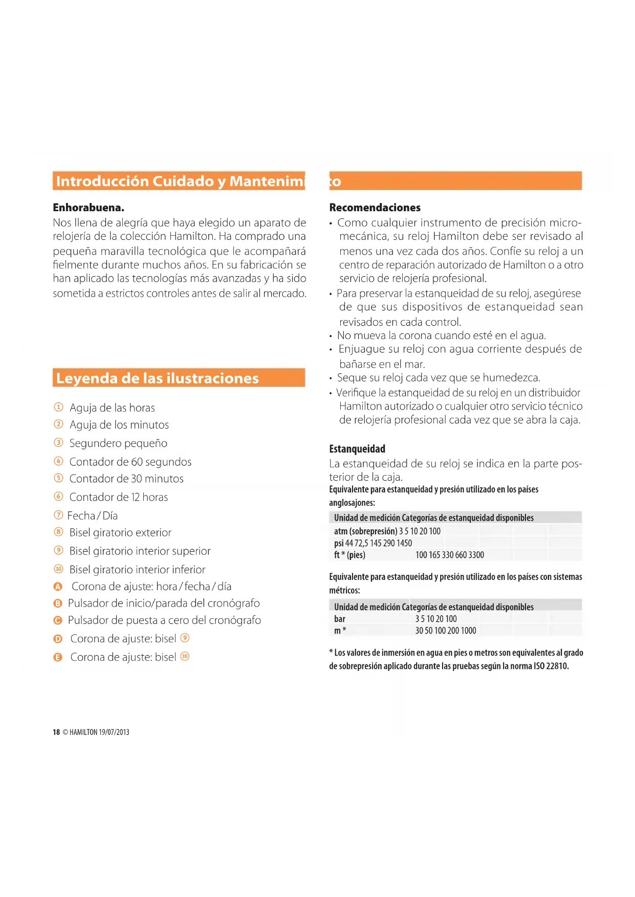 - Los valores de inmersión en agua en pies o metros son equivalentes al grado de sobrepresión aplicado durante las pruebas según la norma ISO 22810.INSTRUCTION MANUAL 19 Correas de cuero Hamilton le recomienda que siga los siguientes pasos para mantener las correas de cuero en buen estado: