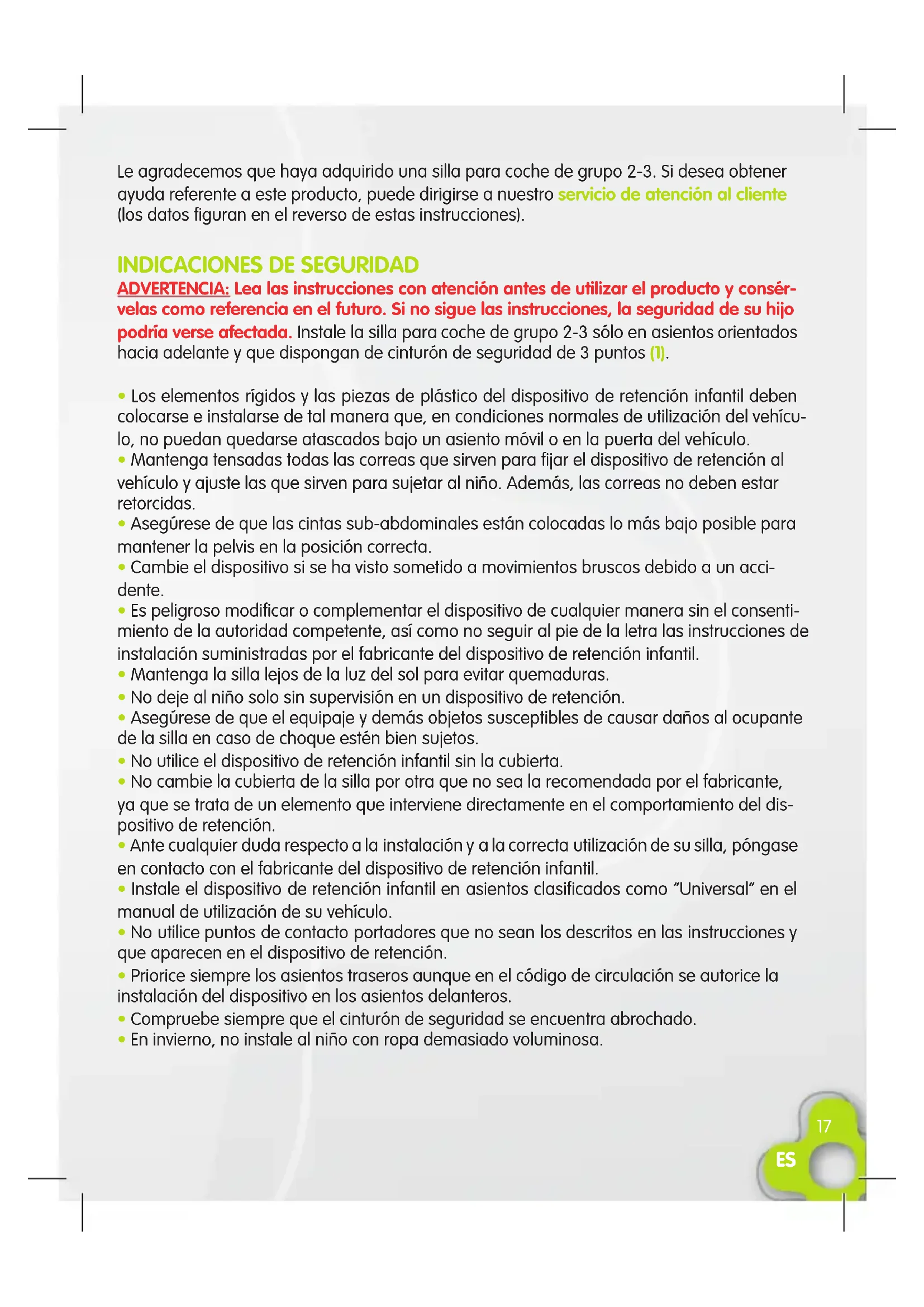 Le agradecemos que haya adquirido una silla para coche de grupo 2-3. Si desea obtener ayuda referente a este producto, puede dirigirse a nuestro servicio de atención al cliente (los datos figuran en el reverso de estas instrucciones).