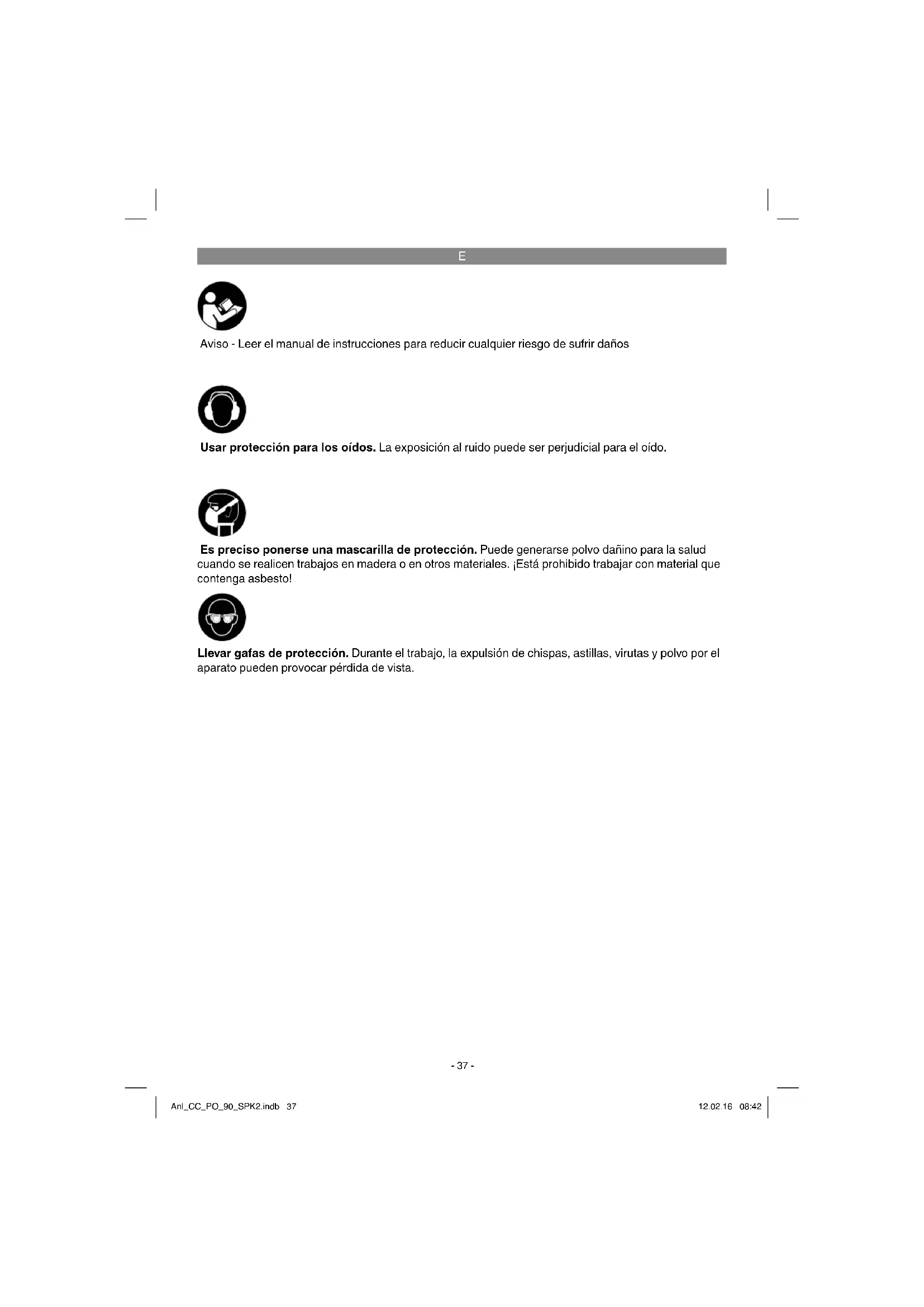 Aviso - Leer el manual de instrucciones para reducir cualquier riesgo de sufrir daños Usar protección para los oídos. La exposición al ruido puede ser perjudicial para el oído. Llevar gafas de protección. Durante el trabajo, la expulsión de chispas, astillas, virutas y polvo por el aparato pueden provocar pérdida de vista. Es preciso ponerse una mascarilla de protección. Puede generarse polvo dañino para la salud cuando se realicen trabajos en madera o en otros materiales. ¡Está prohibido trabajar con material que contenga asbesto! Anl_CC_PO_90_SPK2.indb 37Anl_CC_PO_90_SPK2.indb 37 12.02.16 08:4212.02.16 08:42E