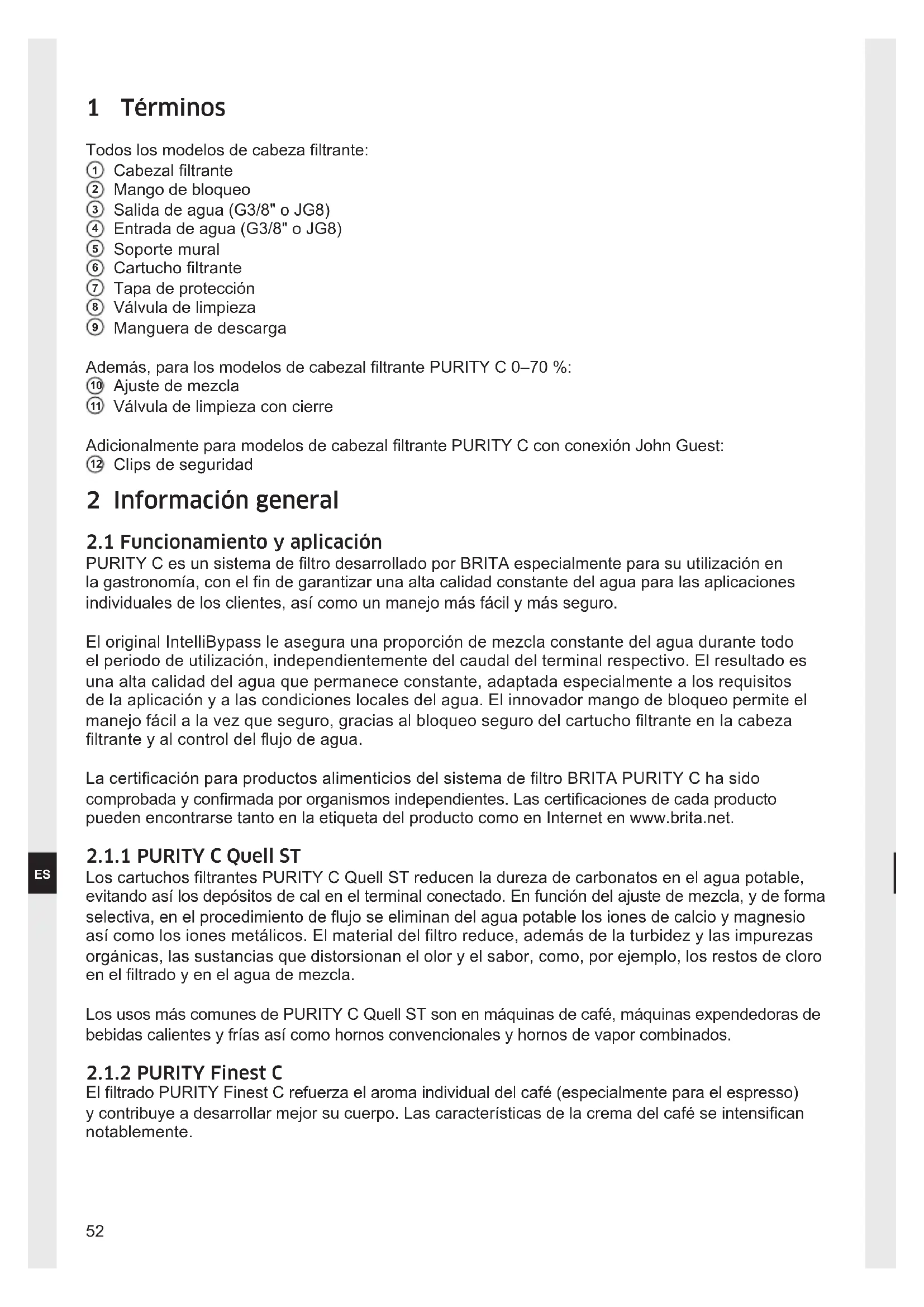 PURITY C es un sistema de ltro desarrollado por BRITA especialmente para su utilización en la gastronomía, con el n de garantizar una alta calidad constante del agua para las aplicaciones individuales de los clientes, así como un manejo más fácil y más seguro. El original IntelliBypass le asegura una proporción de mezcla constante del agua durante todo el periodo de utilización, independientemente del caudal del terminal respectivo. El resultado es una alta calidad del agua que permanece constante, adaptada especialmente a los requisitos de la aplicación y a las condiciones locales del agua. El innovador mango de bloqueo permite el manejo fácil a la vez que seguro, gracias al bloqueo seguro del cartucho ltrante en la cabeza ltrante y al control del ujo de agua. La certicación para productos alimenticios del sistema de ltro BRITA PURITY C ha sido comprobada y conrmada por organismos independientes. Las certicaciones de cada producto pueden encontrarse tanto en la etiqueta del producto como en Internet en www.brita.net.