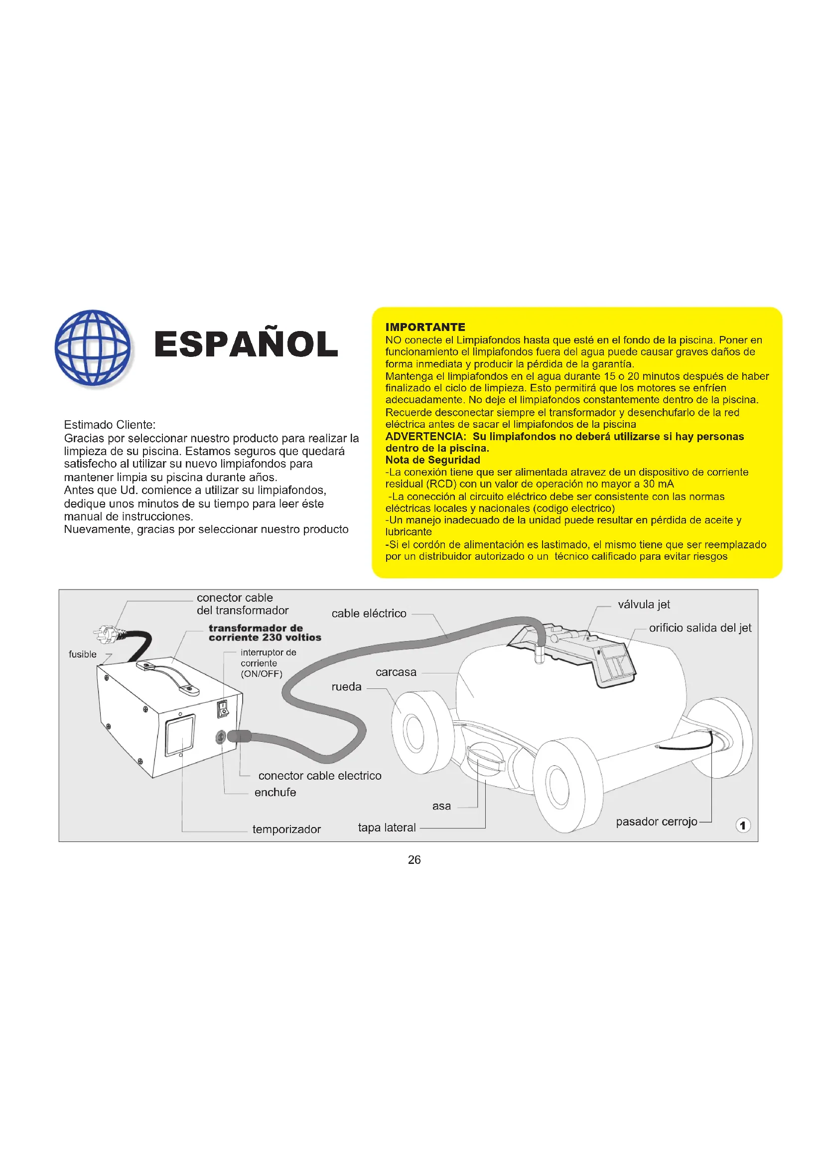 Gracias por seleccionar nuestro producto para realizar la limpieza de su piscina. Estamos seguros que quedará satisfecho al utiliser su nuevo limpiafondos para mantener limpia su piscina durante años.