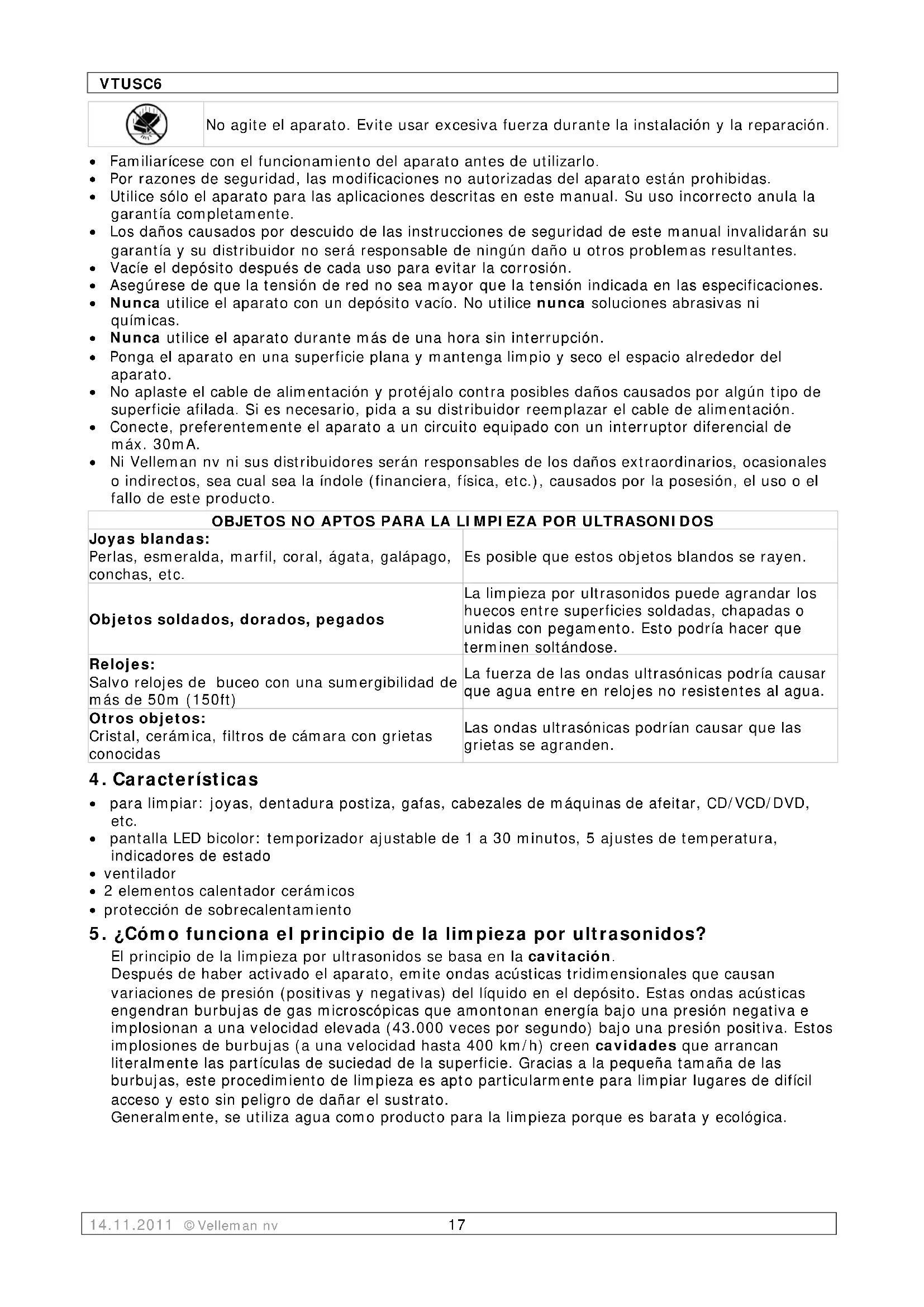 VTUSC6 - Limpiador ultrasónico VELLEMAN - Manual de uso y guía de instrucciones gratis