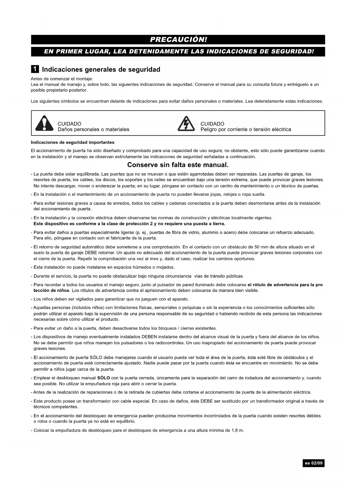 EN PRIMER LUGAR, LEA DETENIDAMENTE LAS INDICACIONES DE SEGURIDAD! PRECAUCIÓN! CUIDADO Peligro por corriente o tensión eléctrica es 02/09Utilización correcta El aparato está concebido para la apertura y el cierre de puertas de garaje basculantes y seccionales en el ámbito privado. El aparato no es indicado para el uso industrial, solamente en puertas de garaje pri- vadas concebidas para un hogar individual. Todo uso inapropiado del accionamiento entraña considerables peligros de accidente. El fabri- cante no asume responsabilidad alguna por el uso inapropiado. Volumen de suministro Antes del montaje, compruebe la integridad de las piezas sumin- istradas. Nota: La numeración sólo es de validez para el capítulo corre- spondiente. Vista general del producto Esta ilustración le ofrece siempre para el montaje gradual de la insta- lación una vista general completa sobre la instalación montada. Antes de empezar NOTA IMPORTANTE Si su garaje no tiene una entrada lateral deberá instalarse un desblo- queo de emergencia externo. Éste permite, en caso de corte de corri- ente, el accionamiento manual de la puerta de garaje desde el exterior. Requisitos El abridor de puerta de garaje sólo es indicado para el montaje de puertas de garaje de una pieza con raíl de desplazamiento horizontal (puerta basculante) (ilust. A) y para puertas seccionales con raíl de desplazamiento curvado (ilust. B). Nota: La instalación no puede utilizarse para las puertas de garaje de una pieza con raíles de desplazamiento horizontales y verticales o puertas o puertas basculantes de dos hojas. Preparación Comprobar en primer lugar si su puerta está compensada y en equilib- rio. Abra ligeramente su puerta hasta la mitad y suéltela. La puerta no puede modificar su posición de manera autónoma, sino que debe permanecer en esa posición solamente por la fuerza de resorte. Fuerza de movimiento: máxima 15kg.