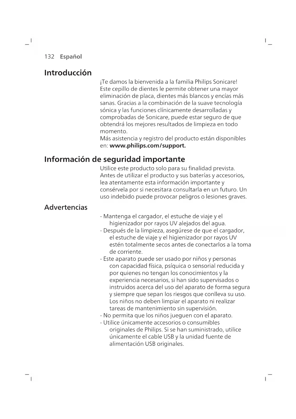 Español Introducción ¡Te damos la bienvenida a la familia Philips Sonicare! Este cepillo de dientes le permite obtener una mayor eliminación de placa, dientes más blancos y encías más sanas. Gracias a la combinación de la suave tecnología sónica y las funciones clínicamente desarrolladas y comprobadas de Sonicare, puede estar seguro de que obtendrá los mejores resultados de limpieza en todo momento. Más asistencia y registro del producto están disponibles en: www.philips.com/support. Información de seguridad importante Utilice este producto solo para su finalidad prevista. Antes de utilizar el producto y sus baterías y accesorios, lea atentamente esta información importante y consérvela por si necesitara consultarla en un futuro. Un uso indebido puede provocar peligros o lesiones graves. Advertencias - Mantenga el cargador, el estuche de viaje y el higienizador por rayos UV alejados del agua. - Después de la limpieza, asegúrese de que el cargador, el estuche de viaje y el higienizador por rayos UV estén totalmente secos antes de conectarlos a la toma de corriente. - Este aparato puede ser usado por niños y personas con capacidad física, psíquica o sensorial reducida y por quienes no tengan los conocimientos y la experiencia necesarios, si han sido supervisados o instruidos acerca del uso del aparato de forma segura y siempre que sepan los riesgos que conlleva su uso. Los niños no deben limpiar el aparato ni realizar tareas de mantenimiento sin supervisión. - No permita que los niños jueguen con el aparato. - Utilice únicamente accesorios o consumibles originales de Philips. Si se han suministrado, utilice únicamente el cable USB y la unidad fuente de alimentación USB originales.133 Español - Este aparato no contiene piezas manipulables por el usuario. Si el aparato está dañado, deje de usarlo y póngase en contacto con el Servicio de Atención al Cliente de su país (consulte "Garantía y asistencia"). - Si el cable USB o la unidad fuente de alimentación USB están dañados, deje de utilizarlos. - No utilice el cargador, el estuche de viaje ni el higienizador por rayos UV al aire libre ni cerca de superficies calientes. - No lave ninguna pieza del producto en el lavavajillas. - Este aparato ha sido diseñado únicamente para limpiar los dientes, las encías y la lengua. - Mantenga el higienizador por rayos UV fuera del alcance de los niños en todo momento. - Deje de utilizar el higienizador por rayos UV si la lámpara/LED de rayos UV permanece encendida o cuando el higienizador por rayos UV esté abierto. La luz UV puede ser perjudicial para los ojos y la piel de las personas. - Utilice el higienizador únicamente con la pantalla protectora colocada en su lugar. - No toque la lámpara de rayos UV del higienizador por rayos UV cuando esté caliente. - No utilice un cabezal de cepillo si tiene las cerdas aplastadas o curvadas. Sustituya el cabezal del cepillo cada tresmeses o antes si aparecen signos de desgaste. - Evite el contacto directo con los productos que contengan aceites esenciales o aceite de coco. El contacto puede provocar el desplazamiento de las cerdas. - La altitud máxima de uso es de 4500metros.
