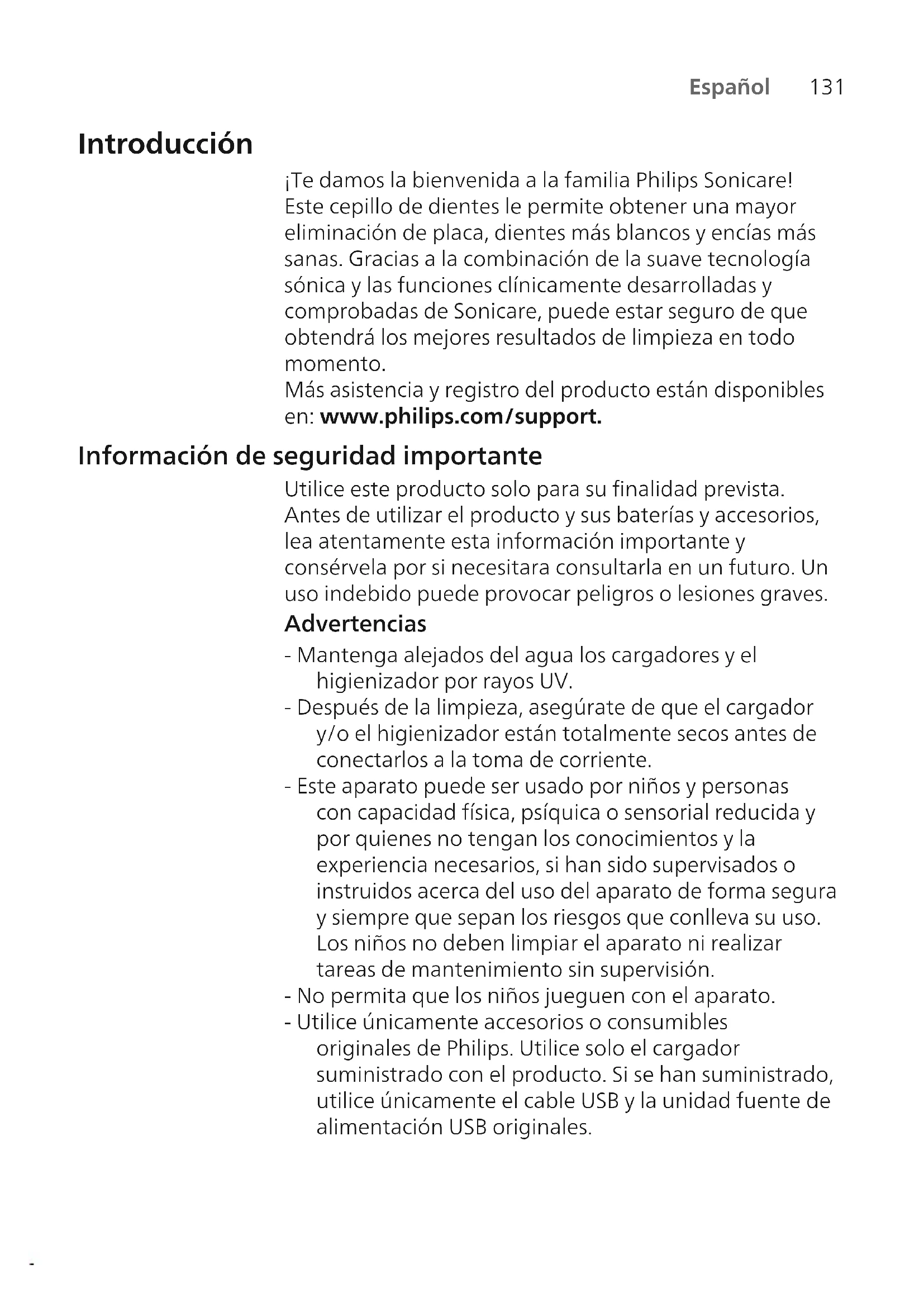 Español Introducción ¡Te damos la bienvenida a la familia Philips Sonicare! Este cepillo de dientes le permite obtener una mayor eliminación de placa, dientes más blancos y encías más sanas. Gracias a la combinación de la suave tecnología sónica y las funciones clínicamente desarrolladas y comprobadas de Sonicare, puede estar seguro de que obtendrá los mejores resultados de limpieza en todo momento. Más asistencia y registro del producto están disponibles en: www.philips.com/support. Información de seguridad importante Utilice este producto solo para su finalidad prevista. Antes de utilizar el producto y sus baterías y accesorios, lea atentamente esta información importante y consérvela por si necesitara consultarla en un futuro. Un uso indebido puede provocar peligros o lesiones graves. Advertencias - Mantenga alejados del agua los cargadores y el higienizador por rayos UV. - Después de la limpieza, asegúrate de que el cargador y/o el higienizador están totalmente secos antes de conectarlos a la toma de corriente. - Este aparato puede ser usado por niños y personas con capacidad física, psíquica o sensorial reducida y por quienes no tengan los conocimientos y la experiencia necesarios, si han sido supervisados o instruidos acerca del uso del aparato de forma segura y siempre que sepan los riesgos que conlleva su uso. Los niños no deben limpiar el aparato ni realizar tareas de mantenimiento sin supervisión. - No permita que los niños jueguen con el aparato. - Utilice únicamente accesorios o consumibles originales de Philips. Utilice solo el cargador suministrado con el producto. Si se han suministrado, utilice únicamente el cable USB y la unidad fuente de alimentación USB originales.132 Español - Este aparato no contiene piezas manipulables por el usuario. Si el aparato está dañado, deje de usarlo y póngase en contacto con el Servicio de Atención al Cliente de su país. Dispositivos con cable solamente: si el cable está dañado, cambie el cargador con higienizador por uno nuevo. - No utilice el cargador ni el higienizador al aire libre ni cerca de superficies calientes. - No lave ninguna pieza del producto en el lavavajillas. - Este aparato ha sido diseñado únicamente para limpiar los dientes, las encías y la lengua. - Mantenga el higienizador fuera del alcance de los niños en todo momento. - Deje de utilizar el higienizador si la lámpara de rayos UV permanece encendida cuando la puerta está abierta. La luz UV puede ser perjudicial para los ojos y la piel de las personas. - Utilice el higienizador únicamente con la pantalla protectora colocada en su lugar. - No toque la lámpara de rayos UV del higienizador por rayos UV cuando esté caliente. - No utilice un cabezal de cepillo si tiene las cerdas aplastadas o curvadas. Sustituya el cabezal del cepillo cada tresmeses o antes si aparecen signos de desgaste. - Evite el contacto directo con los productos que contengan aceites esenciales o aceite de coco. El contacto puede provocar el desplazamiento de las cerdas. - Deje de utilizar el aparato y consulte a su dentista o médico si se produce un sangrado excesivo después del uso, si el sangrado continúa después de 1semana de uso o si experimenta molestias o dolor. - Consulte a su dentista antes de utilizar este aparato si ha sufrido cirugía oral o de las encías en los 2 últimos meses. - Si lleva un marcapasos o cualquier otro dispositivo implantado, consulte con su médico o con el fabricante del dispositivo antes de utilizar el aparato. - Si tiene alguna duda médica, consulte a su médico antes de utilizar este aparato.133 Español - Se trata de un aparato de higiene personal y no ha sido concebido para su uso en múltiples pacientes de clínicas o instituciones. Instrucciones de seguridad sobre baterías - Este aparato contiene baterías que solo deben extraerlas personas cualificadas - Utiliza este producto solo para su finalidad prevista. Antes de utilizar el producto y sus baterías y accesorios, lea atentamente esta información y consérvela por si necesitara consultarla en un futuro. Un uso indebido puede provocar peligros o lesiones graves. Los accesorios suministrados pueden variar según los diferentes productos. - Utilice únicamente accesorios y consumibles originales de Philips. Utilice únicamente la unidad de alimentación desmontable TCBxxxx, HX6100, HX6110, HX6160 o WAAxxxx. - Mantenga el producto y las baterías lejos del fuego y no los exponga a la luz directa del sol ni a altas temperaturas. - Si el producto se calienta en exceso, emite algún olor, cambia de color o tarda más de lo habitual en cargarse, deje de cargarlo y usarlo y póngase en contacto con Philips. - No coloque los productos y sus baterías en hornos microondas o en cocinas de inducción. - Para evitar que las baterías se calienten o liberen sustancias tóxicas o peligrosas, no abra, modifique, perfore, dañe ni desmonte el producto ni la batería. No cortocircuite ni sobrecargue las baterías ni las cargue con la polaridad invertida. - Las baterías que contiene este aparato no se pueden sustituir. Al finalizar la vida útil de la batería, el producto se debe desechar correctamente (consulte la sección sobre reciclaje). - Si las baterías están dañadas o tienen fugas, evite el contacto con la piel o los ojos. Si esto ocurre, enjuague inmediatamente a fondo con agua y busque atención médica. - Al manipular las baterías, asegúrese de que sus manos, el producto y las baterías estén secos.134 Español - Para evitar cortocircuitos accidentales de las baterías después de la extracción, no deje que los terminales de la batería entren en contacto con objetos metálicos (por ejemplo, monedas, horquillas, anillos). No envuelva las baterías en papel de aluminio. Coloque cinta adhesiva en los terminales de las baterías o introduzca las baterías en una bolsa de plástico antes de desecharlas. - Cargue, utilice y guarde el producto a una temperatura d