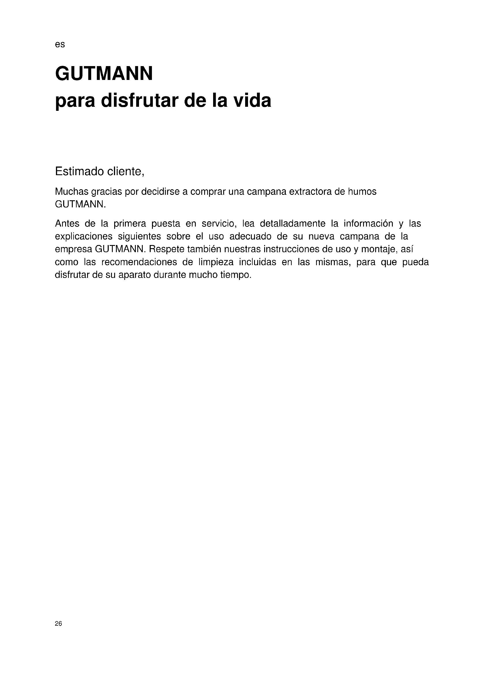 Estimado cliente, Muchas gracias por decidirse a comprar una campana extractora de humos GUTMANN. Antes de la primera puesta en servicio, lea detalladamente la información y las explicaciones siguientes sobre el uso adecuado de su nueva campana de la empresa GUTMANN. Respete también nuestras instrucciones de uso y montaje, así como las recomendaciones de limpieza incluidas en las mismas, para que pueda disfrutar de su aparato durante mucho tiempo.es