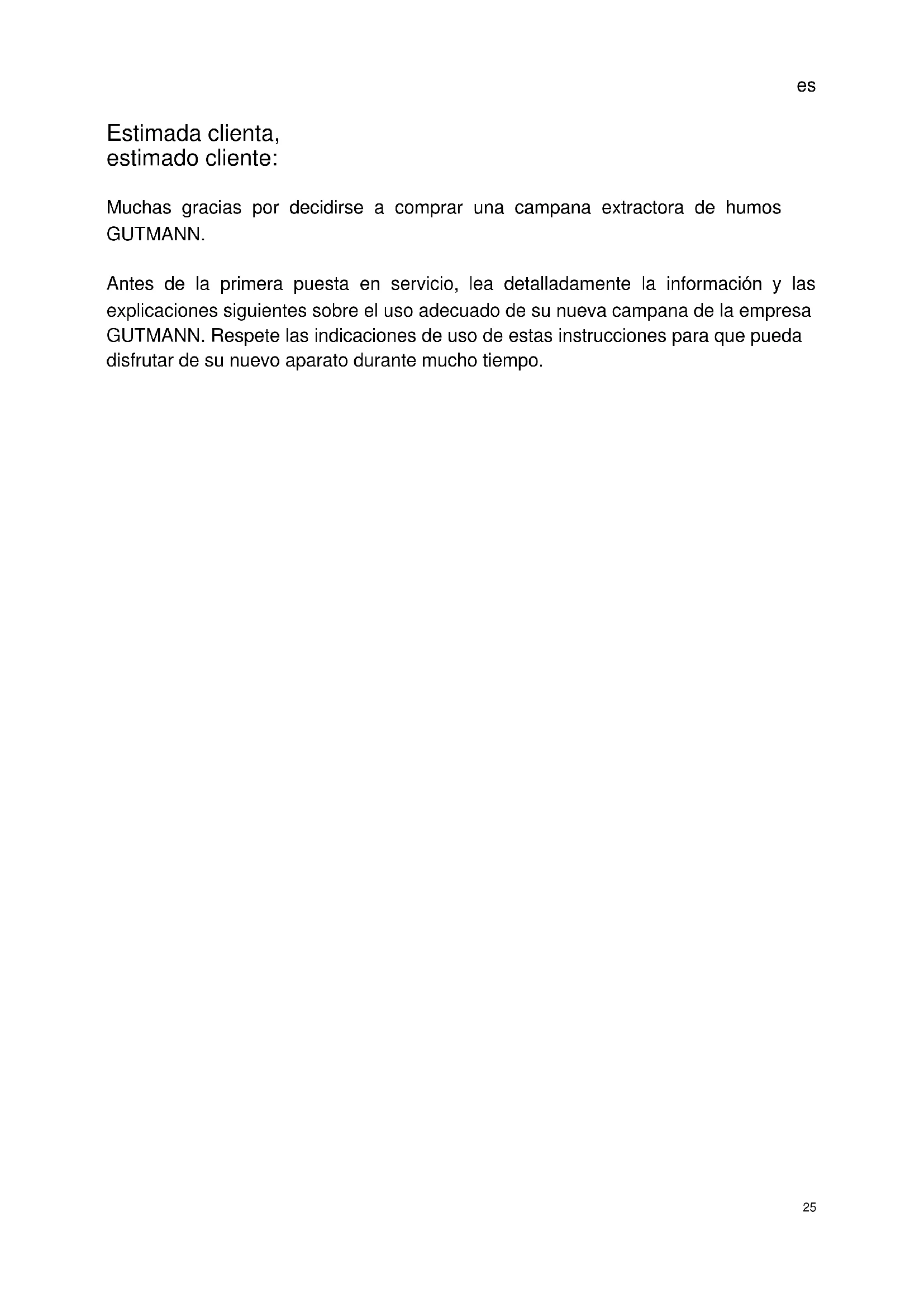 Estimada clienta, estimado cliente: Muchas gracias por decidirse a comprar una campana extractora de humos GUTMANN. Antes de la primera puesta en servicio, lea detalladamente la información y las explicaciones siguientes sobre el uso adecuado de su nueva campana de la empresa GUTMANN. Respete las indicaciones de uso de estas instrucciones para que pueda disfrutar de su nuevo aparato durante mucho tiempo.es