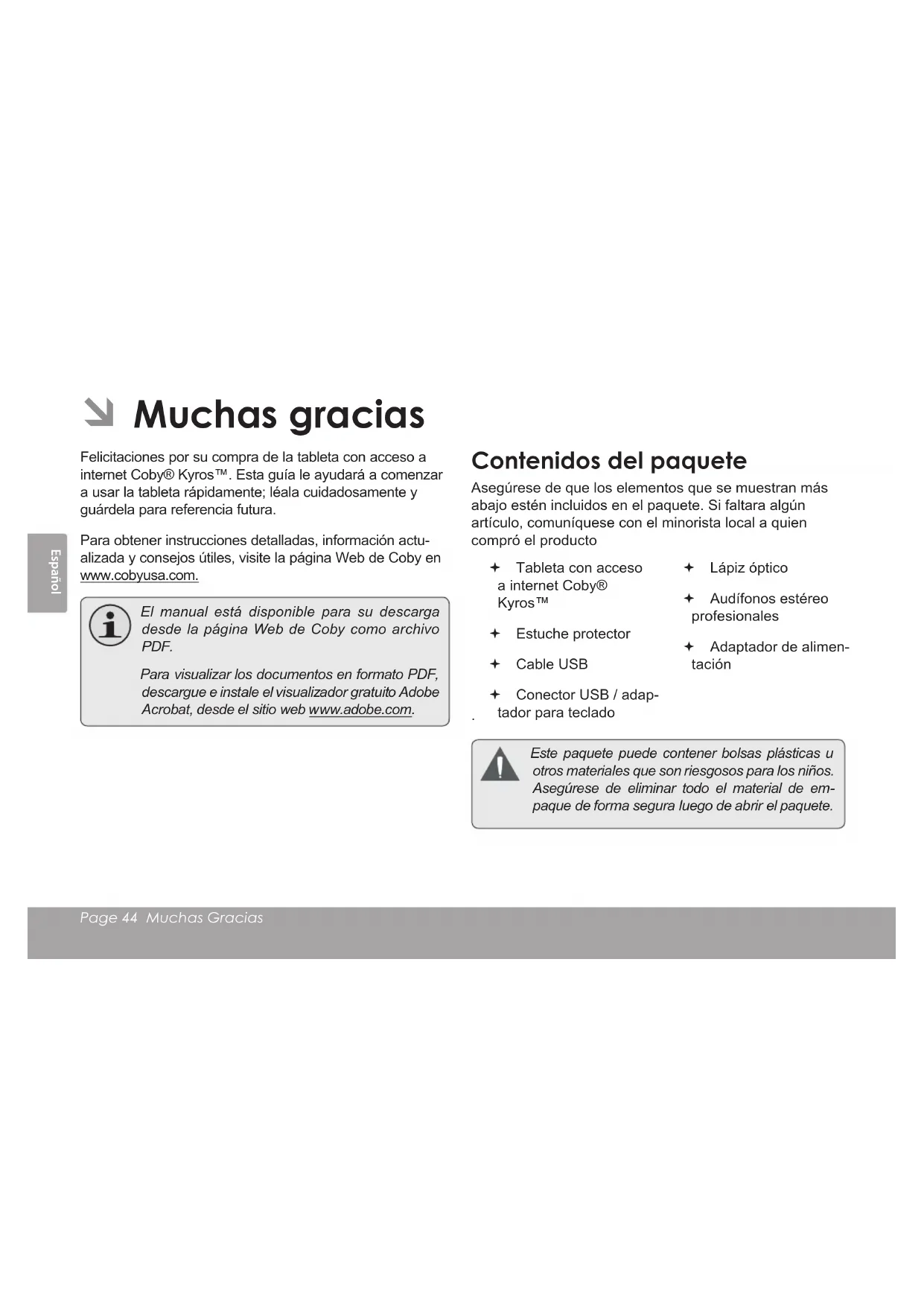 La tableta viene diseñada para utilizarla en forma táctil lo cual permite el acceso a las funciones fácilmente. Utilice la punta de su dedo (o un lápiz) para seleccionar el icono deseado en la pantalla. Si te toca de forma prolongada la pantalla, se registrará como una pulsación continua. Para evitar daños en la pantalla, no la toque condemasiadafuerzaoconcualquierotroob- jetopunzanteutilicesololapuntadesudedoo ellápiztáctil.Paramejorrespuesta,asegúrese detenerlas manoslimpiasantes de usar los controlesdepantallatáctil. Película de protección Una película delgada se le ha aplicado a la pantalla táctil para protegerla durante el transporte. Este protector debe ser removido antes de su uso. Para retirarlo, basta con tomar un borde del protector y despegarlo de la pantalla táctil. Usando el lápiz táctil Un lápiz táctil se incluye para su conveniencia. Se puede utilizar la punta del lápiz para hacer selecciones precisas sobre la pantalla táctil. El lápiz se guarda en la esquina superior izquierda de la tableta. Colóquelo en su lugar de almace- namiento cuando no está en uso. Acciones Sobre la Pantalla Táctil Puede controlar las funciones de la tableta utilizando la pantalla táctil en combinación con las tres teclas situadas en el marco. Para el control de la tableta con la pantalla táctil, usar la punta del dedo o el lápiz para accionar iconos, botones, menú, el teclado en pantalla, y otros elementos que aparecen en la pantalla. Puede realizar las siguientes acciones en la pantalla táctil usando la punta de su dedo o el lápiz táctil. Toque (Touch) Para activar un elemento de la pantalla (por ejemplo, iconos de aplicaciones, botones, menús elementos, y la letra y símbolos de la teclado en pantalla), sólo tiene que tocar con la punta del dedo o el lápiz. Tocar y Sostener Algunos iconos que aparecen en pantalla tienen varias funciones si se tocan y sos- tienen por unos segundos (por ejemplo, abrir un menú, o activar la función de arrastre). Al tocar y no levantar el dedo se acciona la fun- ción de arrastre. no levante la punta del dedo o el lápiz hasta que la acción se produzca.Español Page 50 Conozca La Tableta Coby Kyros Arrastre: Arrastre un icono de la pantalla para cambiar suposición (por ejemplo, una aplicación en la pantalla de inicio). Para arrastrar un Icono, tóquelo y manténgalo sostenido por un momen- to, luego sin levantar el dedo / lápiz, muévalo sobre la pantalla hasta que el Icono llegue a la posición deseada. Deslizar: Deslice hacia arriba / abajo la pantalla para desplazarse a través de las diferentes aplica- ciones. En algunas pantallas, es posible que pueda deslizar hacia la izquierda / derecha . Para accionar el deslizamiento toque y mueva rápidamente, no se detenga en la pantalla hasta localizar la aplicación desea. Pulse dos veces: Rápidamente tocar en la pantalla dos veces en una página web o en una aplicación activa el Zoom o aumento de tamaño. Lo cual se puede realizar hasta determinar el tamaño deseado.
