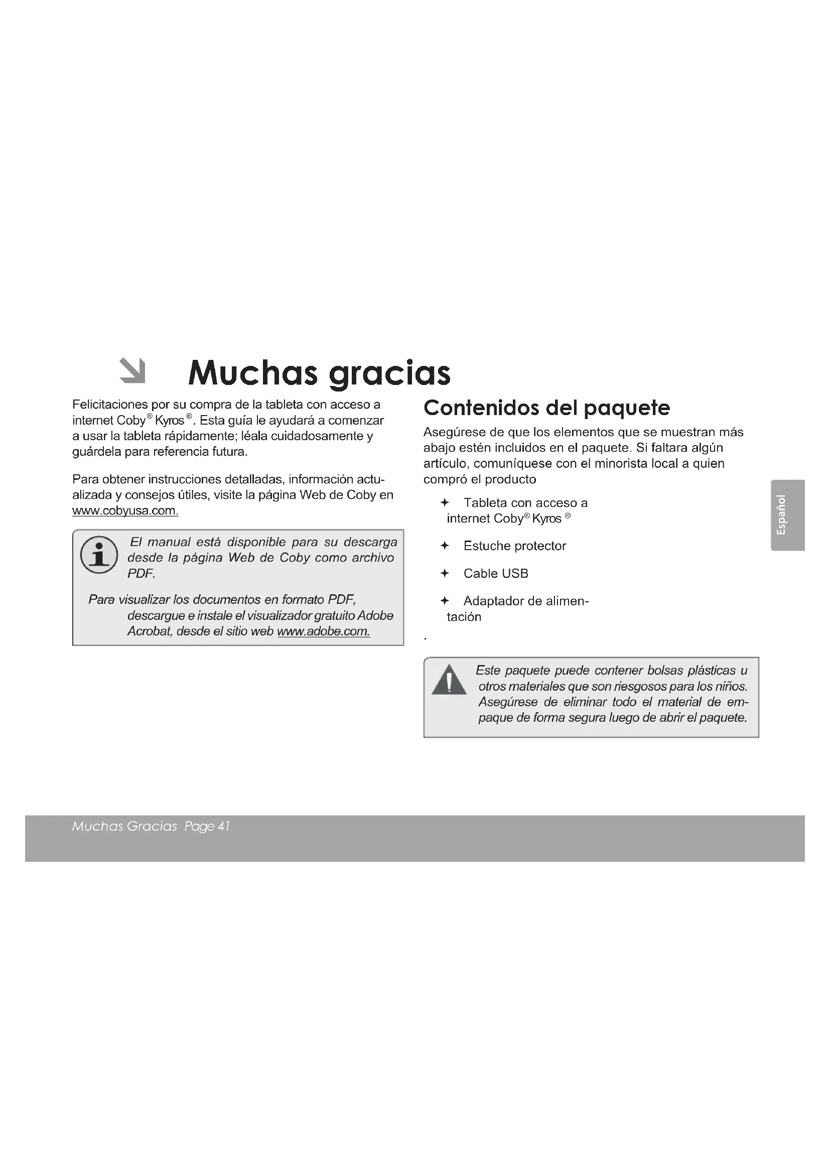 Índice de ContenidosEspañol Muchas Gracias Page 41  Muchas gracias Felicitaciones por su compra de la tableta con acceso a internet Coby