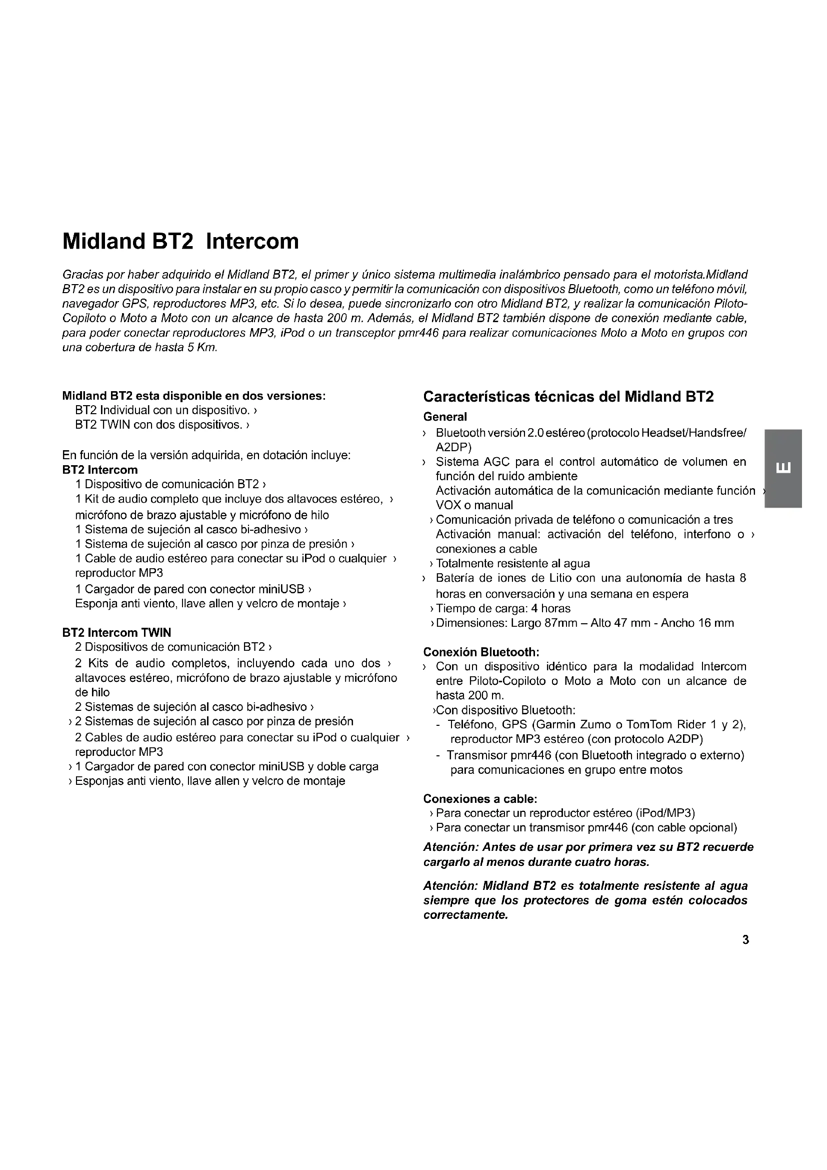 Midland BT2 esta disponible en dos versiones: BT2 Individual con un dispositivo. › BT2 TWIN con dos dispositivos. › En función de la versión adquirida, en dotación incluye: BT2 Intercom 1 Dispositivo de comunicación BT2 › 1 Kit de audio completo que incluye dos altavoces estéreo, › micrófono de brazo ajustable y micrófono de hilo 1 Sistema de sujeción al casco bi-adhesivo › 1 Sistema de sujeción al casco por pinza de presión › 1 Cable de audio estéreo para conectar su iPod o cualquier › reproductor MP3 1 Cargador de pared con conector miniUSB › Esponja anti viento, llave allen y velcro de montaje › BT2 Intercom TWIN 2 Dispositivos de comunicación BT2 › 2 Kits de audio completos, incluyendo cada uno dos › altavoces estéreo, micrófono de brazo ajustable y micrófono de hilo 2 Sistemas de sujeción al casco bi-adhesivo › 2 Sistemas de sujeción al casco por pinza de presión › 2 Cables de audio estéreo para conectar su iPod o cualquier › reproductor MP3 1 Cargador de pared con conector miniUSB y doble carga › Esponjas anti viento, llave allen y velcro de montaje › Características técnicas del Midland BT2 General Bluetooth versión 2.0 estéreo (protocolo Headset/Handsfree/ › A2DP) Sistema AGC para el control automático de volumen en › función del ruido ambiente Activación automática de la comunicación mediante función › VOX o manual Comunicación privada de teléfono o comunicación a tres › Activación manual: activación del teléfono, interfono o › conexiones a cable Totalmente resistente al agua › Batería de iones de Litio con una autonomía de hasta 8 › horas en conversación y una semana en espera Tiempo de carga: 4 horas › Dimensiones: Largo 87mm – Alto 47 mm - Ancho 16 mm › Conexión Bluetooth: Con un dispositivo idéntico para la modalidad Intercom › entre Piloto-Copiloto o Moto a Moto con un alcance de hasta 200 m. Con dispositivo Bluetooth: › - Teléfono, GPS (Garmin Zumo o TomTom Rider 1 y 2), reproductor MP3 estéreo (con protocolo A2DP) - Transmisor pmr446 (con Bluetooth integrado o externo) para comunicaciones en grupo entre motos Conexiones a cable: Para conectar un reproductor estéreo (iPod/MP3) › Para conectar un transmisor pmr446 (con cable opcional) › Atención: Antes de usar por primera vez su BT2 recuerde cargarlo al menos durante cuatro horas. Atención: Midland BT2 es totalmente resistente al agua siempre que los protectores de goma estén colocados correctamente. Midland BT2 Intercom Gracias por haber adquirido el Midland BT2, el primer y único sistema multimedia inalámbrico pensado para el motorista.Midland BT2 es un dispositivo para instalar en su propio casco y permitir la comunicación con dispositivos Bluetooth, como un teléfono móvil, navegador GPS, reproductores MP3, etc. Si lo desea, puede sincronizarlo con otro Midland BT2, y realizar la comunicación Piloto- Copiloto o Moto a Moto con un alcance de hasta 200 m. Además, el Midland BT2 también dispone de conexión mediante cable, para poder conectar reproductores MP3, iPod o un transceptor pmr446 para realizar comunicaciones Moto a Moto en grupos con una cobertura de hasta 5 Km.4