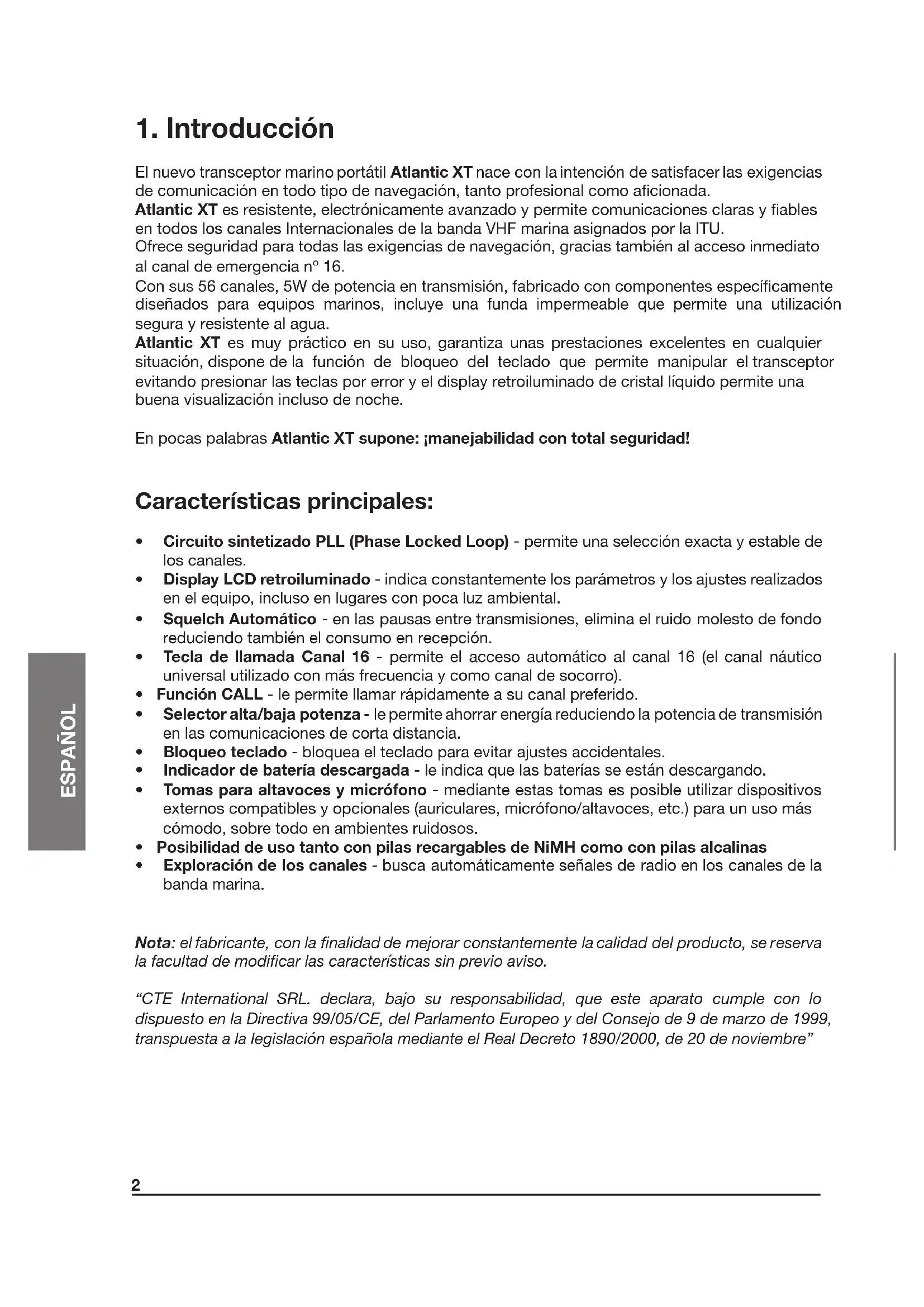 - Exploración de los canales - busca automáticamente señales de radio en los canales de la banda marina. Nota: el fabricante, con la finalidad de mejorar constantemente la calidad del producto, se reserva la facultad de modificar las características sin previo aviso. “CTE International SRL. declara, bajo su responsabilidad, que este aparato cumple con lo dispuesto en la Directiva 99/05/CE, del Parlamento Europeo y del Consejo de 9 de marzo de 1999, transpuesta a la legislación española mediante el Real Decreto 1890/2000, de 20 de noviembre”3 ESPAÑOL