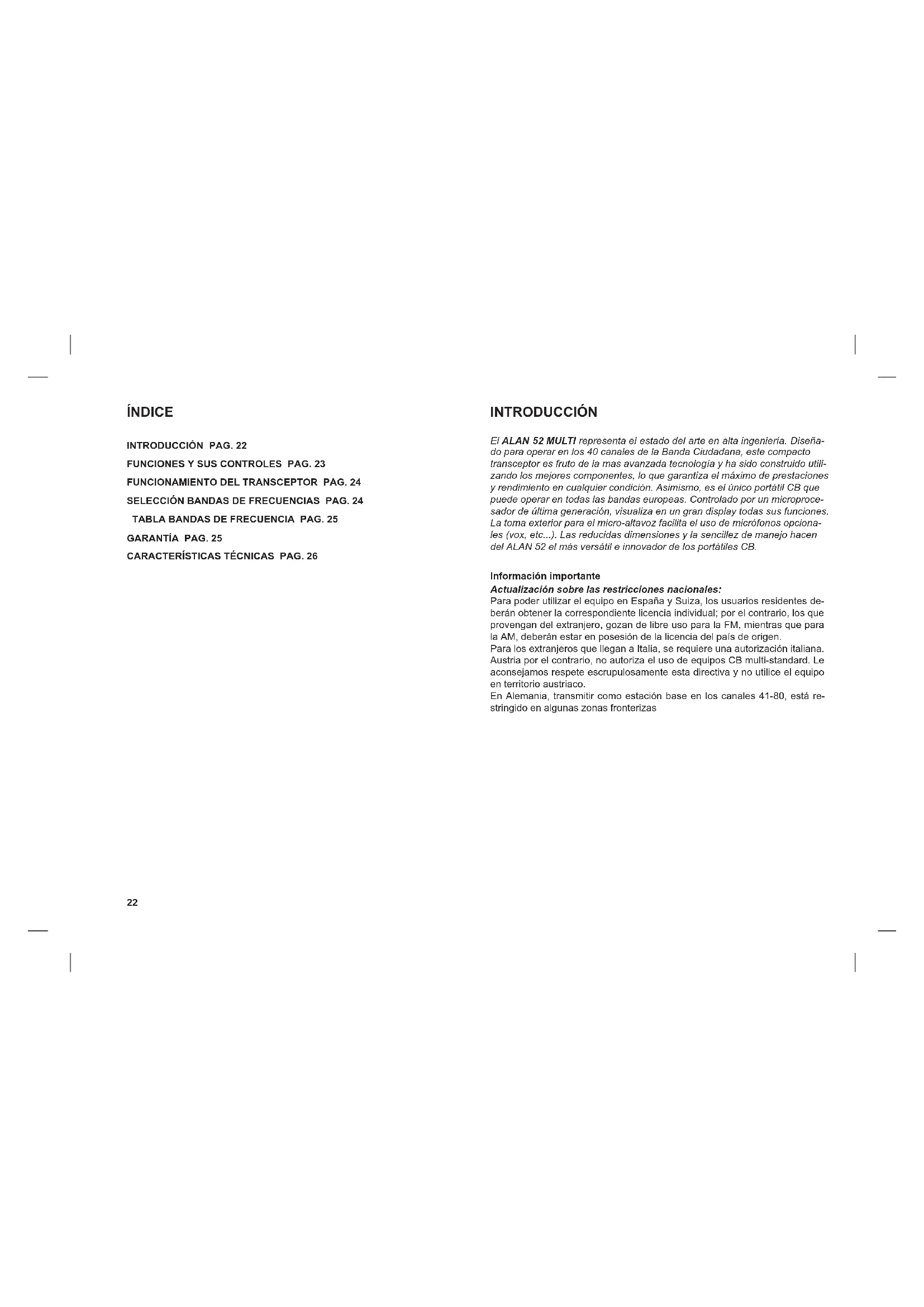 INTRODUCCIÓN El ALAN 52 MULTI representa el estado del arte en alta ingeniería. Diseña- do para operar en los 40 canales de la Banda Ciudadana, este compacto transceptor es fruto de la mas avanzada tecnología y ha sido construido utili- zando los mejores componentes, lo que garantiza el máximo de prestaciones y rendimiento en cualquier condición. Asimismo, es el único portátil CB que puede operar en todas las bandas europeas. Controlado por un microproce- sador de última generación, visualiza en un gran display todas sus funciones. La toma exterior para el micro-altavoz facilita el uso de micrófonos opciona- les (vox, etc...). Las reducidas dimensiones y la sencillez de manejo hacen del ALAN 52 el más versátil e innovador de los portátiles CB. Información importante Actualización sobre las restricciones nacionales: Para poder utilizar el equipo en España y Suiza, los usuarios residentes de- berán obtener la correspondiente licencia individual; por el contrario, los que provengan del extranjero, gozan de libre uso para la FM, mientras que para la AM, deberán estar en posesión de la licencia del país de origen. Para los extranjeros que llegan a Italia, se requiere una autorización italiana. Austria por el contrario, no autoriza el uso de equipos CB multi-standard. Le aconsejamos respete escrupulosamente esta directiva y no utilice el equipo en territorio austriaco. En Alemania, transmitir como estación base en los canales 41-80, está re- stringido en algunas zonas fronterizas23
