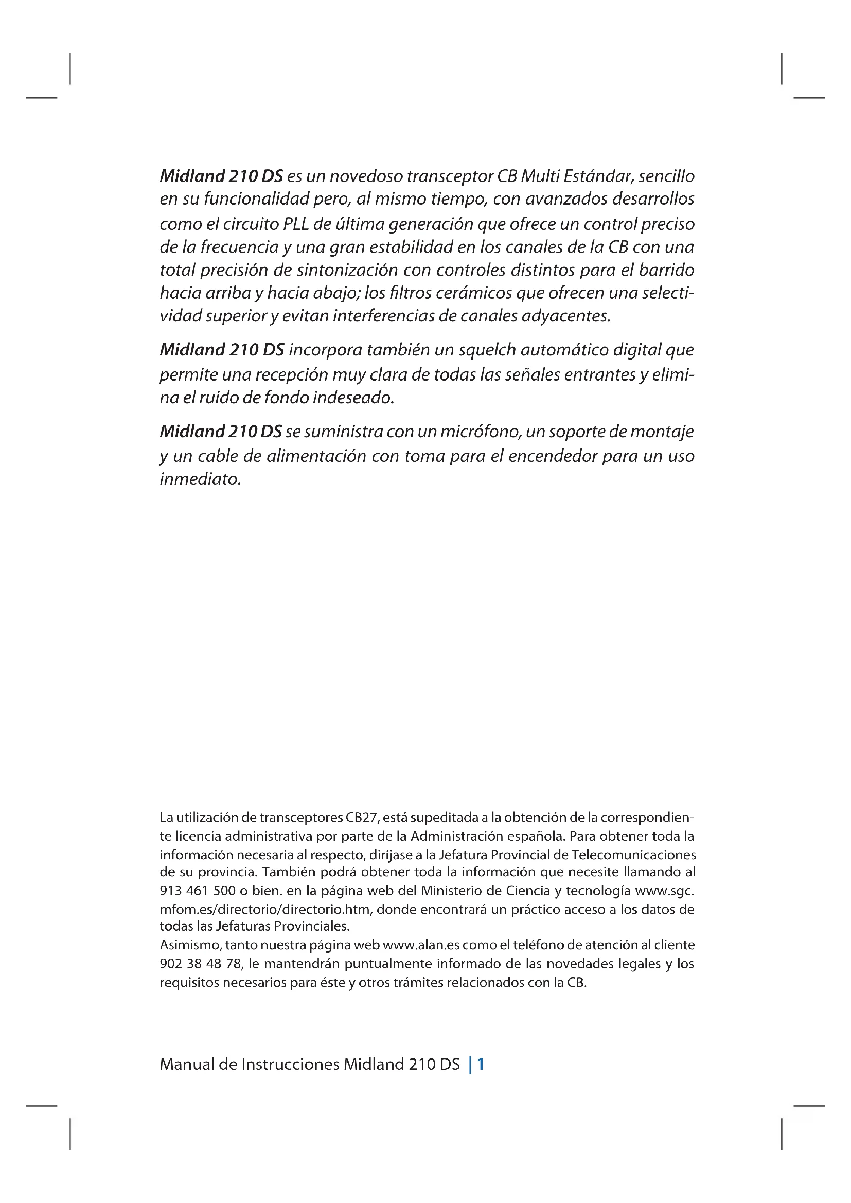 - (Abdeckung aller in der EU erlaubten Frequenzbänder) Ein jederzeit frei zugänglicher Trennschalter muss installiert sein. Beide Pole müssen gleichzeitig getrennt werden. Hiermit erklärt CTE International, dass dieses Gerät den grundlegenden Anforderungen sowie weiteren relevanten Bestimmungen der EU-Richtlinie 99/05/EC entspricht.Manual de Instrucciones Midland 210 DS | 1 Midland 210 DS es un novedoso transceptor CB Multi Estándar, sencillo en su funcionalidad pero, al mismo tiempo, con avanzados desarrollos como el circuito PLL de última generación que ofrece un control preciso de la frecuencia y una gran estabilidad en los canales de la CB con una total precisión de sintonización con controles distintos para el barrido hacia arriba y hacia abajo; los filtros cerámicos que ofrecen una selecti- vidad superior y evitan interferencias de canales adyacentes. Midland 210 DS incorpora también un squelch automático digital que permite una recepción muy clara de todas las señales entrantes y elimi- na el ruido de fondo indeseado. Midland 210 DS se suministra con un micrófono, un soporte de montaje y un cable de alimentación con toma para el encendedor para un uso inmediato. La utilización de transceptores CB27, está supeditada a la obtención de la correspondien- te licencia administrativa por parte de la Administración española. Para obtener toda la información necesaria al respecto, diríjase a la Jefatura Provincial de Telecomunicaciones de su provincia. También podrá obtener toda la información que necesite llamando al 913 461 500 o bien. en la página web del Ministerio de Ciencia y tecnología www.sgc. mfom.es/directorio/directorio.htm, donde encontrará un práctico acceso a los datos de todas las Jefaturas Provinciales. Asimismo, tanto nuestra página web www.alan.es como el teléfono de atención al cliente 902 38 48 78, le mantendrán puntualmente informado de las novedades legales y los requisitos necesarios para éste y otros trámites relacionados con la CB.2 | Manual de Instrucciones Midland 210 DS