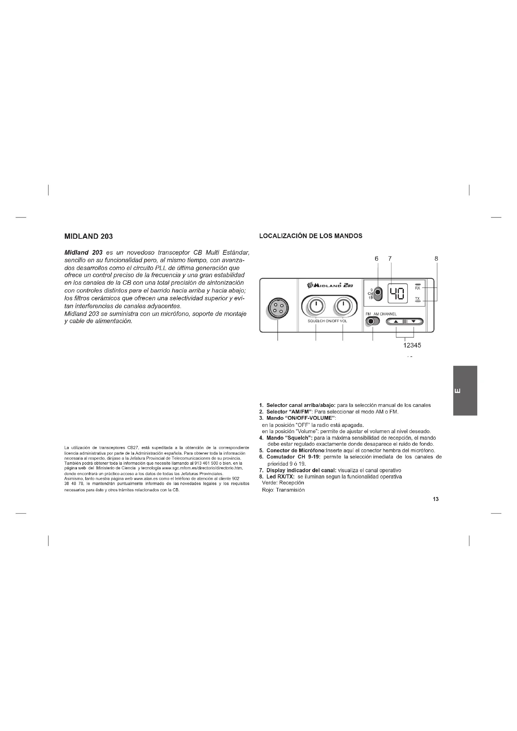 MIDLAND 203 Midland 203 es un novedoso transceptor CB Multi Estándar, sencillo en su funcionalidad pero, al mismo tiempo, con avanza- dos desarrollos como el circuito PLL de última generación que ofrece un control preciso de la frecuencia y una gran estabilidad en los canales de la CB con una total precisión de sintonización con controles distintos para el barrido hacia arriba y hacia abajo; los ltros cerámicos que ofrecen una selectividad superior y evi- tan interferencias de canales adyacentes. Midland 203 se suministra con un micrófono, soporte de montaje y cable de alimentación. La utilización de transceptores CB27, está supeditada a la obtención de la correspondiente licencia administrativa por parte de la Administración española. Para obtener toda la información necesaria al respecto, diríjase a la Jefatura Provincial de Telecomunicaciones de su provincia. También podrá obtener toda la información que necesite llamando al 913 461 500 o bien. en la página web del Ministerio de Ciencia y tecnología www.sgc.mfom.es/directorio/directorio.htm, donde encontrará un práctico acceso a los datos de todas las Jefaturas Provinciales.Asimismo, tanto nuestra página web www.alan.es como el teléfono de atención al cliente 902 38 48 78, le mantendrán puntualmente informado de las novedades legales y los requisitos necesarios para éste y otros trámites relacionados con la CB.