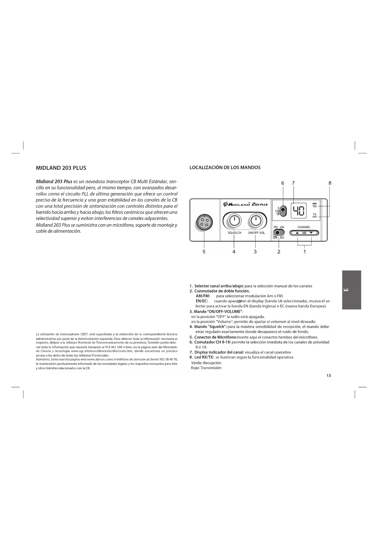 MIDLAND 203 PLUS Midland 203 Plus es un novedoso transceptor CB Multi Estándar, sen- cillo en su funcionalidad pero, al mismo tiempo, con avanzados desar- rollos como el circuito PLL de última generación que ofrece un control preciso de la frecuencia y una gran estabilidad en los canales de la CB con una total precisión de sintonización con controles distintos para el barrido hacia arriba y hacia abajo; los ltros cerámicos que ofrecen una selectividad superior y evitan interferencias de canales adyacentes. Midland 203 Plus se suministra con un micrófono, soporte de montaje y cable de alimentación. La utilización de transceptores CB27, está supeditada a la obtención de la correspondiente licencia administrativa por parte de la Administración española. Para obtener toda la información necesaria al respecto, diríjase a la Jefatura Provincial de Telecomunicaciones de su provincia. También podrá obte- ner toda la información que necesite llamando al 913 461 500 o bien. en la página web del Ministerio de Ciencia y tecnología www.sgc.mfom.es/directorio/directorio.htm, donde encontrará un práctico acceso a los datos de todas las Jefaturas Provinciales. Asimismo, tanto nuestra página web www.alan.es como el teléfono de atención al cliente 902 38 48 78, le mantendrán puntualmente informado de las novedades legales y los requisitos necesarios para éste y otros trámites relacionados con la CB.