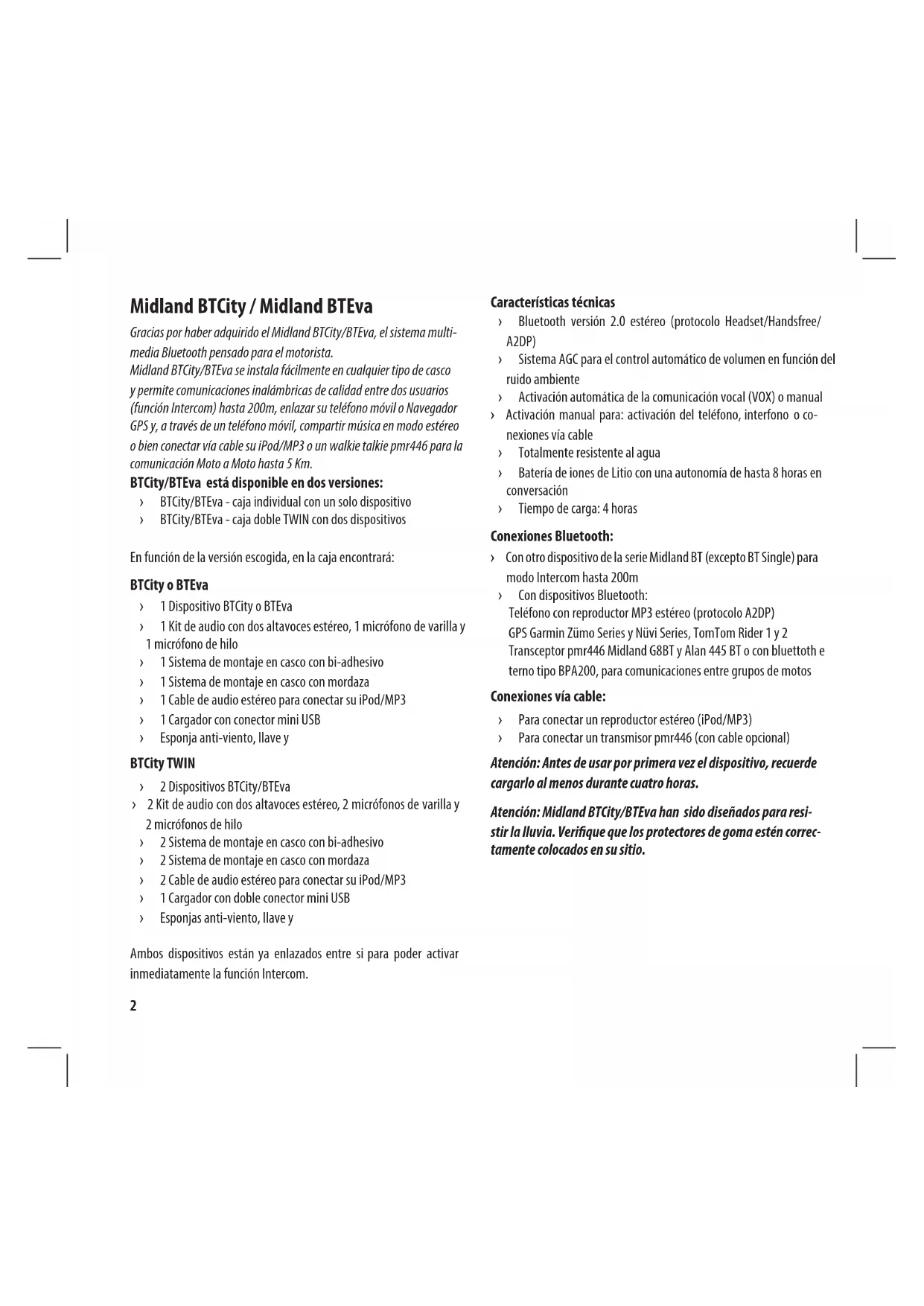 2, de lo contrario salga del modo Setup haciendo doble clic en la tecla “Control”. Una vez que se apaga la luz ROJA, la luz AZUL empieza a parpadear. Ahora el BT City/Eva está listo para su uso.10 Desactivación de la función VOX (para Intercom y teléfono) Siga el mismo proceso detallado en los pasos anteriores y seleccione la opción 1 (VOX desactivado). Verá la luz AZUL parpadear una sola vez. Conexión por cable siempre activa Esta opción le permite dejar siempre activa la conexión por cable, incluso cuando el teléfono o el intercomunicador están activos. Esta función es muy útil cuando utiliza un walkie talkie pmr446. Activación: › Entre en modo “Setup” y pulse las teclas “Volume+” y “Volume -” durante un segundo. La luz AZUL parpadeará una vez. › Para salir del modo “Setup” pulse dos veces la tecla “Control”. Desactivación: › Siga el proceso descrito anteriormente; ahora, la luz AZUL parpa- deará dos veces. › Para salir del modo “Setup”, pulse dos veces la tecla “Control” Intercom y GPS Desactivación: › Ir al modo “Set up” › Mantenga pulsados “Control” y “Volume -” durante 1 segundo (la luz AZUL parpadeará una vez) › Haga doble click en el pulsador central para salir del modo “Set up” Activación: › Proceda de la misma manera pero esta vez la luz AZUL parpadeará 2 veces. › Haga doble click en el pulsador central para salir del modo “Set up” Consejos para usos especícos El siguiente capítulo proporciona algunas sugerencias para conseguir el máximo de su BT City/Eva. Uso de un transceptor pmr446 Para poder usar un walkie-talkie, deberá utilizar un cable especíco (opcional) que conecte su Midland BT City/Eva con el walkie talkie (BT312 para equipos Midland 2 pin). La comunicación vía radio se produce pulsando el botón de transmisión (PTT) cuando se quiere hablar y soltándolo para escuchar. No es posible hablar y escuchar al mismo tiempo. También se puede activar la transmisión sin pulsar el PTT, mediante la activación de la función VOX. Si desea utilizar una radio pmr446 para comunicaciones en grupo y mantener simultáneamente la función Intercom activa entre los dos BT City/Eva, debe recordar que la función Intercom se activa cada vez que habla, mediante la función VOX del BT City/Eva. Por lo tanto, la comunicación mediante el walkie talkie se desactiva mientras hable con alguien porque tiene un nivel bajo de prioridad comparado con el Intercomunicador. Esto se puede prevenir activando “Conexión por cable siempre activa” o desactivando la función VOX. Desactive la función VOX, como se ha explicado, para asegurarse de que el Intercomunicador no se activará automáticamente cuando ha- ble a través del transceptor pmr446. Para activar la función Intercom usando esta conguración, tendrá que pulsar la tecla “Control” (Esta operación desactiva la comunicación por radio, la cual se activará au- tomáticamente cuando se desactive la función Intercom). ¡Atención! Si desactiva la función VOX, solamente podrá respon- der llamadas entrantes de forma manual, pulsando la tecla “Control”. Uso del accesorio “BT Ski audio kit” (opcional). Este kit opcional es la solución perfecta para el uso de su BT City/Eva también cuando practique deportes de invierno (sin casco o con casco da esquí de tipo “semi rigido”)A