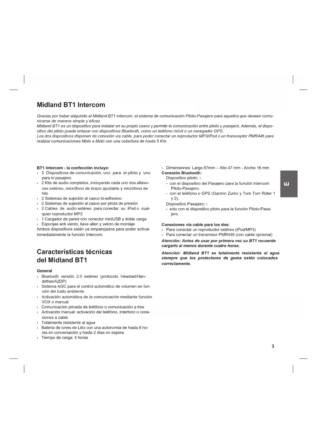Midland BT1 Intercom Gracias por haber adquirido el Midland BT1 intercom, el sistema de comunicación Piloto-Pasajero para aquellos que deseen comu- nicarse de manera simple y ecaz. Midland BT1 es un dispositivo para instalar en su propio casco y permite la comunicación entre piloto y pasajero. Además, el dispo- sitivo del piloto puede enlazar con dispositivos Bluetooth, como un teléfono móvil o un navegador GPS. Los dos dispositivos disponen de conexión vía cable, para poder conectar un reproductor MP3/iPod o un transceptor PMR446 para realizar comunicaciones Moto a Moto con una cobertura de hasta 5 Km. BT1 Intercom - la confección incluye: › 2 Dispositivos de comunicación: uno para el piloto y uno para el pasajero. › 2 Kits de audio completos, incluyendo cada uno dos altavo- ces estéreo, micrófono de brazo ajustable y micrófono de hilo › 2 Sistemas de sujeción al casco bi-adhesivo › 2 Sistemas de sujeción al casco por pinza de presión › 2 Cables de audio estéreo para conectar su iPod o cual- quier reproductor MP3 › 1 Cargador de pared con conector miniUSB y doble carga › Esponjas anti viento, llave allen y velcro de montaje Ambos dispositivos están ya emparejados para poder activar inmediatamente la función Intercom. Características técnicas del Midland BT1 General › Bluetooth versión 2.0 estéreo (protocolo Headset/Han- dsfree/A2DP) › Sistema AGC para el control automático de volumen en fun- ción del ruido ambiente › Activación automática de la comunicación mediante función VOX o manual › Comunicación privada de teléfono o comunicación a tres › Activación manual: activación del teléfono, interfono o cone- xiones a cable › Totalmente resistente al agua › Batería de iones de Litio con una autonomía de hasta 8 ho- ras en conversación y hasta 2 días en espera › Tiempo de carga: 4 horas › Dimensiones: Largo 87mm – Alto 47 mm - Ancho 16 mm Conexión Bluetooth: Dispositivo piloto: › - con el dispositivo del Pasajero para la función Intercom Piloto-Pasajero. - con el teléfono o GPS (Garmin Zumo y Tom Tom Rider 1 y 2). Dispositivo Pasajero: › - solo con el dispositivo piloto para la función Piloto-Pasa- jero. Conexiones vía cable para los dos: › Para conectar un reproductor estéreo (iPod/MP3) › Para conectar un transmisor PMR446 (con cable opcional) Atención: Antes de usar por primera vez su BT1 recuerde cargarlo al menos durante cuatro horas. Atención: Midland BT1 es totalmente resistente al agua siempre que los protectores de goma estén colocados correctamente.4 Carga de las baterías Asegúrese que la unidad estè totalmente cargada antes del uso. Antes de su primera utilización cárguelo al menos 5-6 horas. El tiempo de carga habitual será de 4 horas. Cargue la unidad insertando el cargador de pared en el jack de carga (levante la cubierta de goma para insertar el enchufe). › El LED rojo parpadea cuando se empieza a cargar. › Mantenga la unidad en carga hasta que el mencionado LED se apague. › Cuando la carga este completa, desconecte la unidad del cargador. Descripción del dispositivo y sistema de jación Descripción del BT1 El BT1 está compuesto por una parte frontal con 5 pulsado- res multi-función y, en su parte inferior, tres conexiones para cable. Descripción de los pulsadores multi-función: › Teléfono (sólo para el piloto): Permite activar, desactivar y controlar varias funciones del teléfono. › Intercom: Permite activar y desactivar la función Intercom. › AUXILIAR: Permite la activación y desactivación de las co- nexiones a cable › Volumen+: para aumentar el volumen › Volumen-: para disminuir el volukmen Descripción de las conexiones con cable › Cargador: para la carga del dispositivo mediante el carga- dor con toma miniUSB › Kit de Audio: para la conexión de los auriculares estéreo y micrófono › Toma de audio auxiliar (AUX): permite la conexión de un reproductor de audio iPod/MP3 o transceptor PMR446. Descripción del kit de audio El kit de audio está compuesto por dos altavoces estéreo ul- traplanos y dos tipos de micrófono intercambiables: de brazo ajustable y de hilo. El mini conector del micrófono permite una rápida y sencilla conexión para la utilización de uno u otro. Altavoces estéreo. Los dos altavoces estéreo incluyen velcro adhesivo para una rápida y fácil jación en el interior del casco. Atención, no je denitivamente los adhesivos a su casco ha- sta que haya hecho una prueba de sonoridad sobre su moto y se asegure de su correcta colocación, esto le permitirá jarlos en el lugar preciso para disponer de una perfecta sonoriza- ción. El micrófono se puede jar al casco de dos maneras: Micrófono de brazo ajustable. Posicione la parte del velcro adhesivo en la parte interior rígida del casco, de modo que el micrófono le quede justo frente a la comisura de los labios (el símbolo blanco debe quedar frente a la boca). Este tipo de micrófono es idóneo para cascos modulares o tipo jet. Micrófono de hilo: Posicione el micrófono mediante el velcro adhesivo en el interior del casco frente a la boca. Este tipo de micrófono es el indicado para cascos integrales Cargador Kit audio iPod/MP3 PMR446 Teléfono (sólo para el piloto) Intercom AUX Volumen + Volumen - Luz azul y roja5