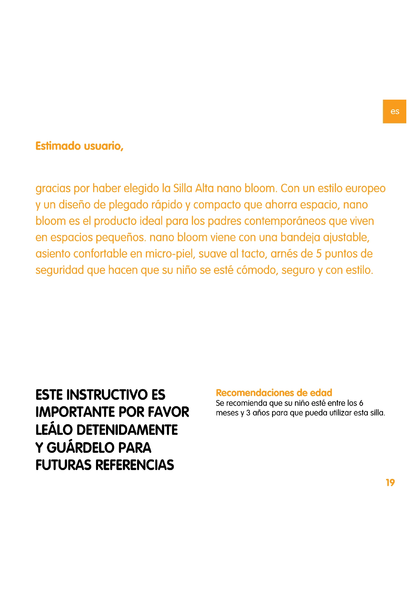 gracias por haber elegido la Silla Alta nano bloom. Con un estilo europeo y un diseño de plegado rápido y compacto que ahorra espacio, nano bloom es el producto ideal para los padres contemporáneos que viven en espacios pequeños. nano bloom viene con una bandeja ajustable, asiento confortable en micro-piel, suave al tacto, arnés de 5 puntos de seguridad que hacen que su niño se esté cómodo, seguro y con estilo.