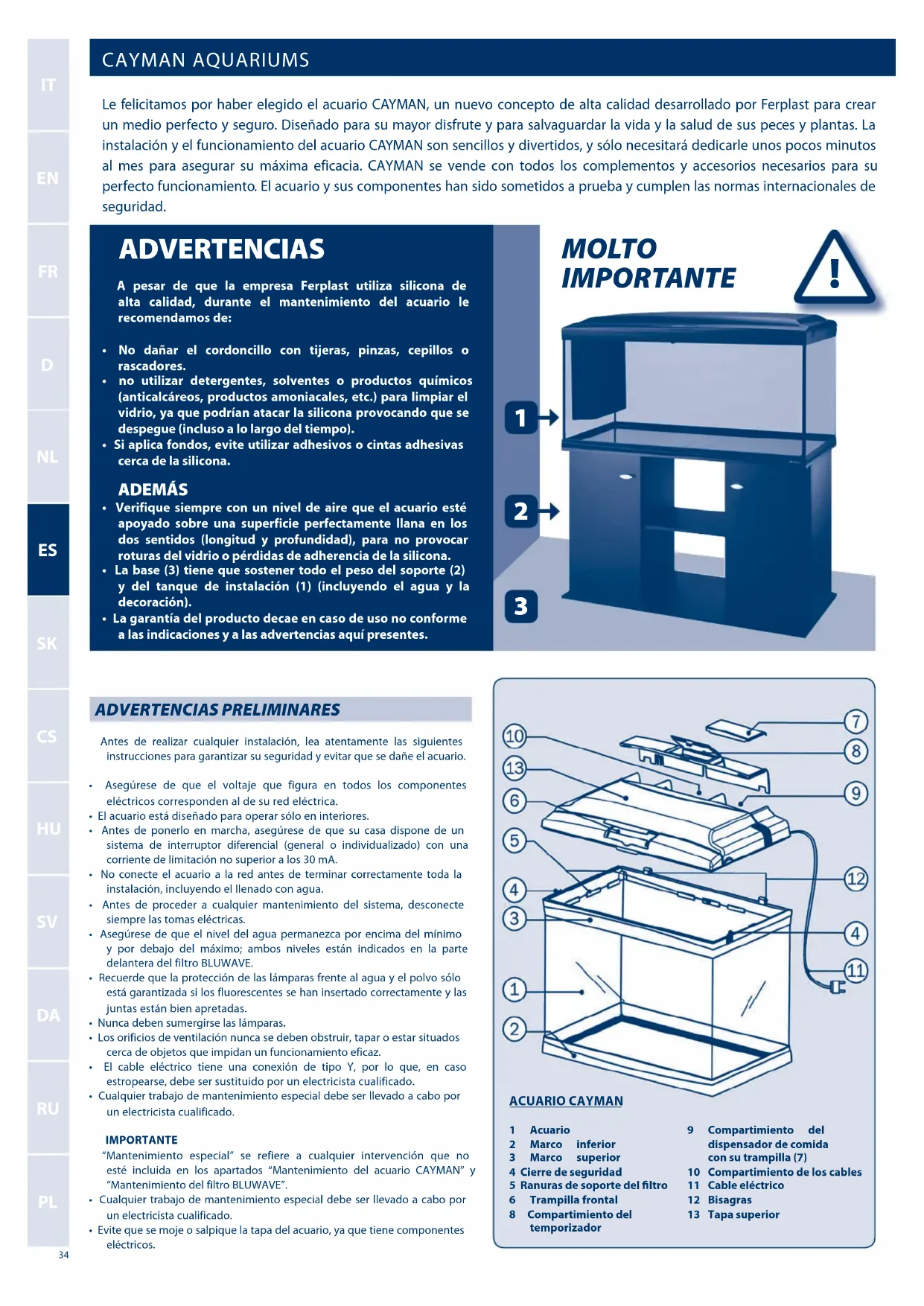 CAYMAN AQUARIUMS ADVERTENCIAS PRELIMINARES Antes de realizar cualquier instalación, lea atentamente las siguientes instrucciones para garantizar su seguridad y evitar que se dañe el acuario.• Asegúrese de que el voltaje que figura en todos los componentes eléctricos corresponden al de su red eléctrica.• El acuario está diseñado para operar sólo en interiores.• Antes de ponerlo en marcha, asegúrese de que su casa dispone de un sistema de interruptor diferencial (general o individualizado) con una corriente de limitación no superior a los 30 mA.• No conecte el acuario a la red antes de terminar correctamente toda la instalación, incluyendo el llenado con agua.• Antes de proceder a cualquier mantenimiento del sistema, desconecte siempre las tomas eléctricas.• Asegúrese de que el nivel del agua permanezca por encima del mínimo y por debajo del máximo; ambos niveles están indicados en la parte delantera del filtro BLUWAVE.• Recuerde que la protección de las lámparas frente al agua y el polvo sólo está garantizada si los fluorescentes se han insertado correctamente y las juntas están bien apretadas.• Nunca deben sumergirse las lámparas.• Los orificios de ventilación nunca se deben obstruir, tapar o estar situados cerca de objetos que impidan un funcionamiento eficaz.• El cable eléctrico tiene una conexión de tipo Y, por lo que, en caso estropearse, debe ser sustituido por un electricista cualificado.• Cualquier trabajo de mantenimiento especial debe ser llevado a cabo por un electricista cualificado. IMPORTANTE “Mantenimiento especial” se refiere a cualquier intervención que no esté incluida en los apartados “Mantenimiento del acuario CAYMAN” y “Mantenimiento del filtro BLUWAVE”.• Cualquier trabajo de mantenimiento especial debe ser llevado a cabo por un electricista cualificado.• Evite que se moje o salpique la tapa del acuario, ya que tiene componentes eléctricos. Le felicitamos por haber elegido el acuario CAYMAN, un nuevo concepto de alta calidad desarrollado por Ferplast para crear un medio perfecto y seguro. Diseñado para su mayor disfrute y para salvaguardar la vida y la salud de sus peces y plantas. La instalación y el funcionamiento del acuario CAYMAN son sencillos y divertidos, y sólo necesitará dedicarle unos pocos minutos al mes para asegurar su máxima eficacia. CAYMAN se vende con todos los complementos y accesorios necesarios para su perfecto funcionamiento. El acuario y sus componentes han sido sometidos a prueba y cumplen las normas internacionales de seguridad.ACUARIO CAYMAN1 Acuario2 Marco inferior 3 Marco superior 4 Cierre de seguridad5 Ranuras de soporte del ltro6 Trampilla frontal8 Compartimiento del temporizador9 Compartimiento del dispensador de comida con su trampilla (7)10 Compartimiento de los cables11 Cable eléctrico12 Bisagras13 Tapa superior