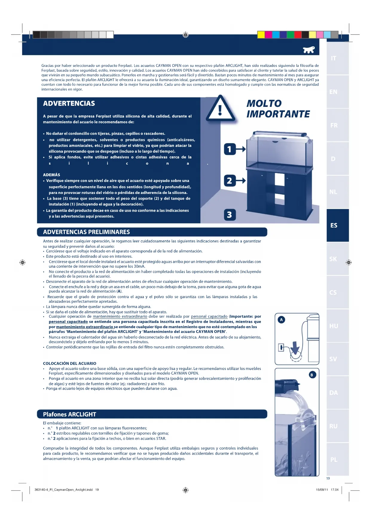 Gracias por haber seleccionado un producto Ferplast. Los acuarios CAYMAN OPEN con su respectivo plafón ARCLIGHT, han sido realizados siguiendo la filosofía de Ferplast, basada sobre seguridad, estilo, innovación y calidad. Los acuarios CAYMAN OPEN han sido concebidos para satisfacer al cliente y tutelar la salud de los peces que vivirán en su pequeño mundo subacuático. Ponerlos en marcha y gestionarlos será fácil y divertido. Bastan pocos minutos de mantenimiento al mes para asegurar una eficiencia perfecta. El plafón ARCLIGHT le ofrecerá a su acuario la iluminación ideal, garantizando un diseño sumamente elegante. CAYMAN OPEN y ARCLIGHT ya cuentan con todo lo necesario para funcionar de la mejor forma posible. Cada uno de sus componentes está homologado y cumple con las normativas de seguridad internacionales en vigor.