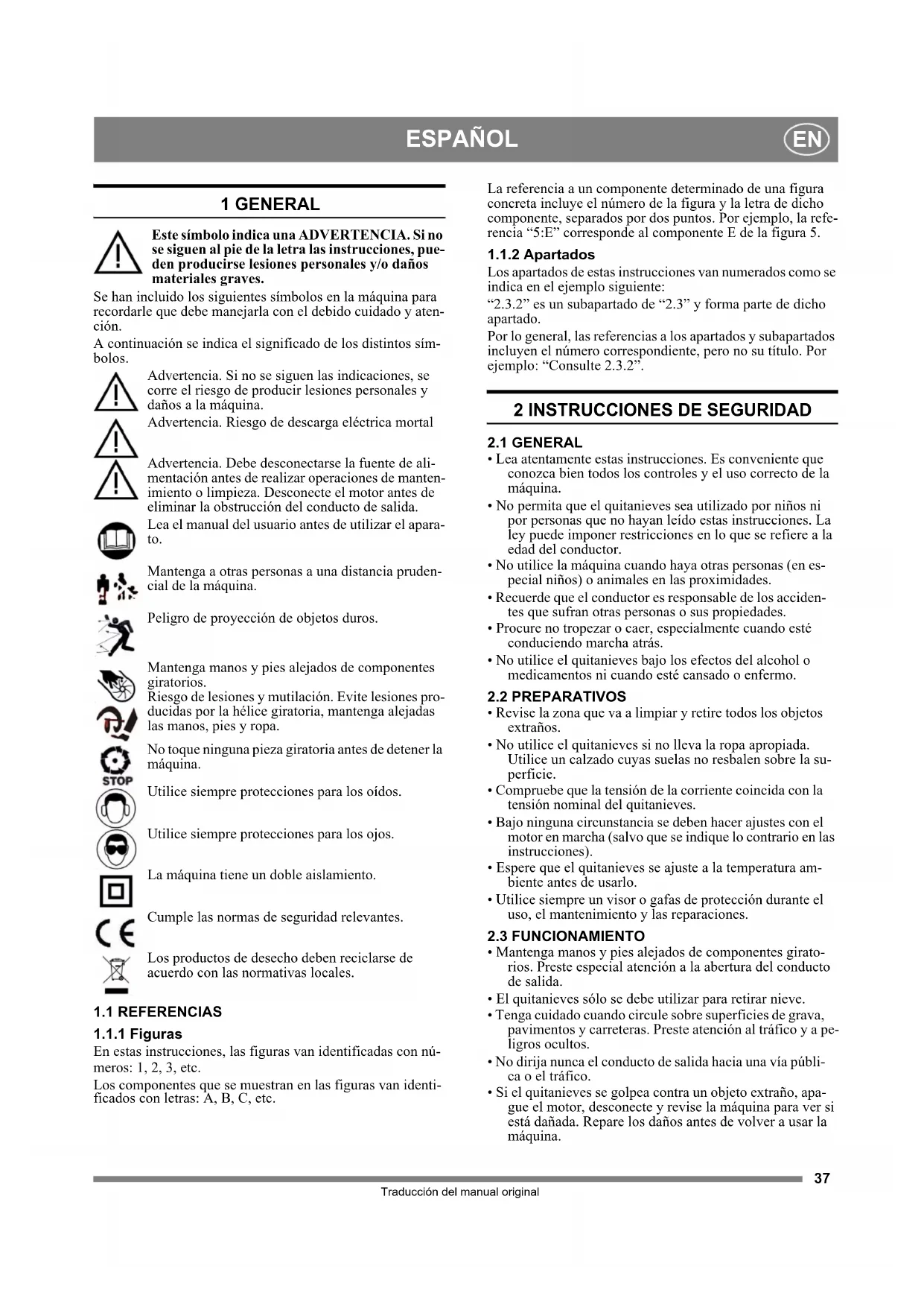 Traducción del manual original 1 GENERAL Este símbolo indica una ADVERTENCIA. Si no se siguen al pie de la letra las instrucciones, pue- den producirse lesiones personales y/o daños materiales graves. Se han incluido los siguientes símbolos en la máquina para recordarle que debe manejarla con el debido cuidado y aten- ción. A continuación se indica el significado de los distintos sím- bolos. Advertencia. Si no se siguen las indicaciones, se corre el riesgo de producir lesiones personales y daños a la máquina. Advertencia. Riesgo de descarga eléctrica mortal Advertencia. Debe desconectarse la fuente de ali- mentación antes de realizar operaciones de manten- imiento o limpieza. Desconecte el motor antes de eliminar la obstrucción del conducto de salida. Lea el manual del usuario antes de utilizar el apara- to. Mantenga a otras personas a una distancia pruden- cial de la máquina. Peligro de proyección de objetos duros. Mantenga manos y pies alejados de componentes giratorios. Riesgo de lesiones y mutilación. Evite lesiones pro- ducidas por la hélice giratoria, mantenga alejadas las manos, pies y ropa. No toque ninguna pieza giratoria antes de detener la máquina. Utilice siempre protecciones para los oídos. Utilice siempre protecciones para los ojos. La máquina tiene un doble aislamiento. Cumple las normas de seguridad relevantes. Los productos de desecho deben reciclarse de acuerdo con las normativas locales.