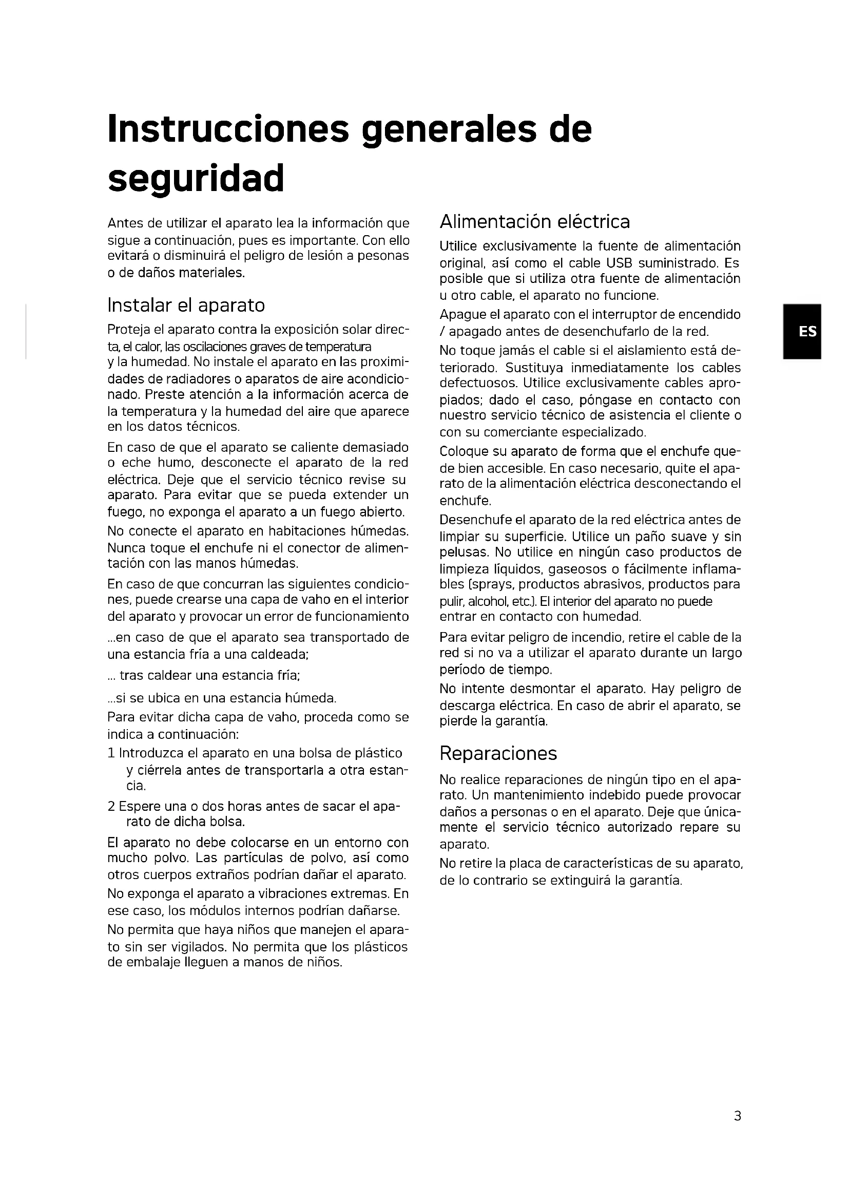 En caso de que el aparato se caliente demasiado o eche humano, desconecte el aparato de la red electrica. Deje que el service Tecnico revise su aparato. Paraatarque se pueda extensions un fuego, no exponga el aparato a un fuego abierto. No conecte el aparato en habitaciones humedes. Nunca toque el enchufe ni el conector de alimentacion con las manos humedes.