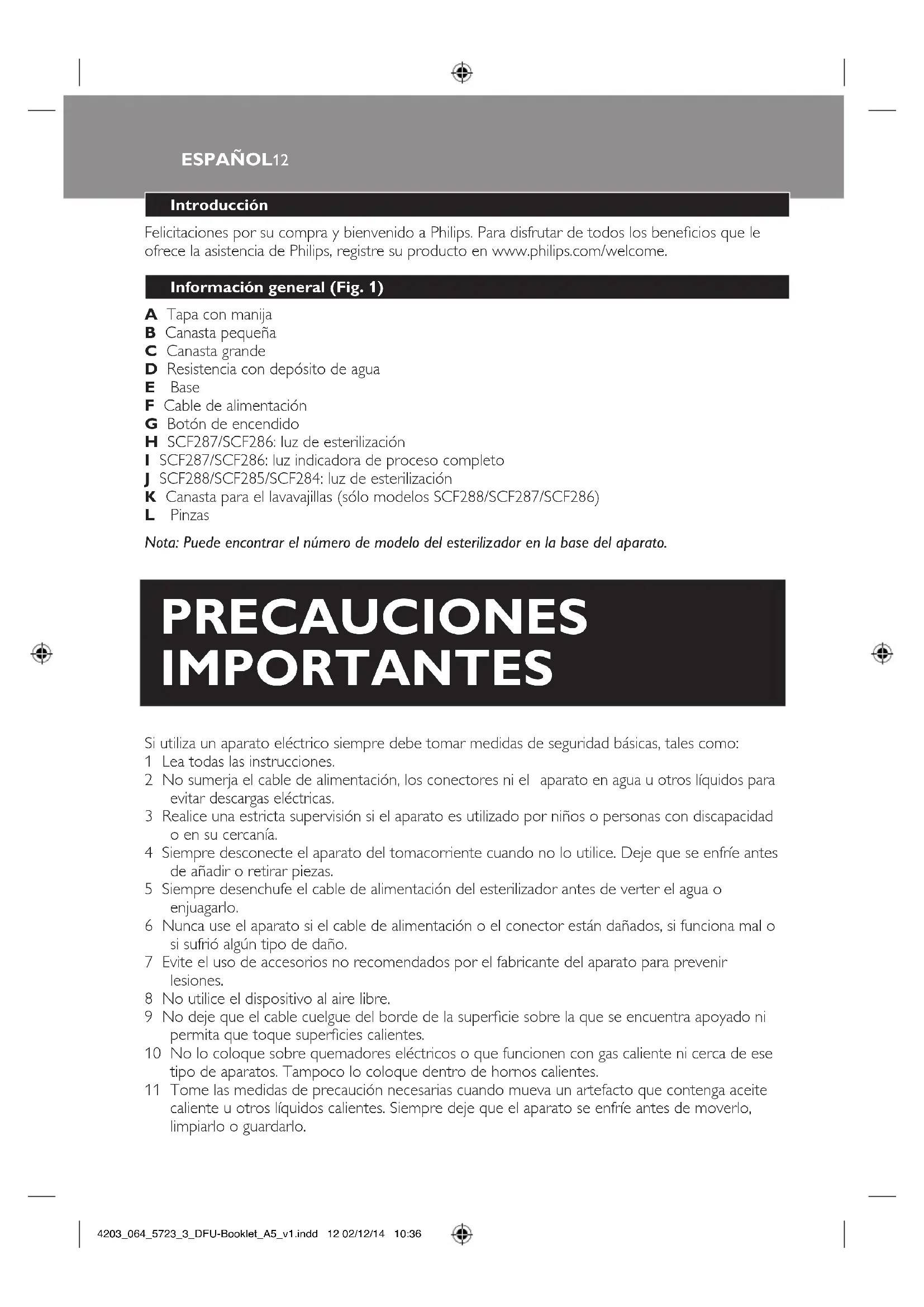 Philips Electronics North America Corporation (USA) and Philips Electronics Ltd (CANADA) warrant each new Philips AVENT product, model SCF288, SCF287, SCF286, SCF285 or SCF284, against defects in materials or workmanship for a period of two years from the date of purchase, and agrees to repair or replace any defective product without charge. IMPORTANT: This warranty does not cover damage resulting from accident, misuse or abuse, lack of reasonable care, or the afxing of any attachment not provided with the product. NO RESPONSIBILITY IS ASSUMED FOR ANY SPECIAL, INCIDENTAL OR CONSEQUENTIAL DAMAGES. In order to obtain warranty service, simply call 1-800-54 AVENT. Note: This appliance needs to be descaled regularly for optimal performance. If you do not do this, the appliance may eventually stop working. In this case, repair is NOT covered by your warranty. Manufactured for: Philips Consumer Lifestyle A Division of Philips Electronics North America Corporation P.O. Box 10313, Stamford, CT 06904 In Canada: Philips Electronics Ltd 281 Hillmount Road, Markham, ON L6C 2S3 ENGLISH 11 4203_064_5723_3_DFU-Booklet_A5_v1.indd 11 02/12/14 10:36Introducción Felicitaciones por su compra y bienvenido a Philips. Para disfrutar de todos los benecios que le ofrece la asistencia de Philips, registre su producto en www.philips.com/welcome. Información general (Fig. 1) A Tapa con manija B Canasta pequeña C Canasta grande D Resistencia con depósito de agua E Base F Cable de alimentación G Botón de encendido H SCF287/SCF286: luz de esterilización I SCF287/SCF286: luz indicadora de proceso completo J SCF288/SCF285/SCF284: luz de esterilización K Canasta para el lavavajillas (sólo modelos SCF288/SCF287/SCF286) L Pinzas Nota: Puede encontrar el número de modelo del esterilizador en la base del aparato. Si utiliza un aparato eléctrico siempre debe tomar medidas de seguridad básicas, tales como: 1 Lea todas las instrucciones. 2 No sumerja el cable de alimentación, los conectores ni el aparato en agua u otros líquidos para evitar descargas eléctricas. 3 Realice una estricta supervisión si el aparato es utilizado por niños o personas con discapacidad o en su cercanía. 4 Siempre desconecte el aparato del tomacorriente cuando no lo utilice. Deje que se enfríe antes de añadir o retirar piezas. 5 Siempre desenchufe el cable de alimentación del esterilizador antes de verter el agua o enjuagarlo. 6 Nunca use el aparato si el cable de alimentación o el conector están dañados, si funciona mal o si sufrió algún tipo de daño. 7 Evite el uso de accesorios no recomendados por el fabricante del aparato para prevenir lesiones. 8 No utilice el dispositivo al aire libre. 9 No deje que el cable cuelgue del borde de la supercie sobre la que se encuentra apoyado ni permita que toque supercies calientes. 10 No lo coloque sobre quemadores eléctricos o que funcionen con gas caliente ni cerca de ese tipo de aparatos. Tampoco lo coloque dentro de hornos calientes. 11 Tome las medidas de precaución necesarias cuando mueva un artefacto que contenga aceite caliente u otros líquidos calientes. Siempre deje que el aparato se enfríe antes de moverlo, limpiarlo o guardarlo. PRECAUCIONES IMPORTANTES ESPAÑOL12 4203_064_5723_3_DFU-Booklet_A5_v1.indd 12 02/12/14 10:36ESPAÑOL 13 12 Desenchufe el artefacto si no está en uso. 13 Utilice el aparato solamente para el n con el que fue creado. 14 MIENTRAS ESTÁ EN USO, EL ESTERILIZADOR CONTIENE AGUA HIRVIENDO Y LA VENTILACIÓN DE LA TAPA DESPIDE VAPOR. 15 Asegúrese de que el esterilizador esté ubicado sobre una supercie rme durante el uso. 16 Nunca mueva ni abra la unidad durante el uso. 17 Mantenga el aparato lejos del alcance de los niños. 18 Nunca coloque elementos sobre el esterilizador. 19 Para detener el funcionamiento del esterilizador durante el ciclo de limpieza, desenchúfelo del tomacorriente. 20 Tenga cuidado al abrir el esterilizador para evitar sufrir quemaduras con el vapor. 21 No use líquidos de limpieza o pastillas que contengan químicos ni blanqueadores en su esterilizador a vapor ni en los productos que desea esterilizar. 22 No use abrasivos, productos antibacteriales ni líquidos abrasivos para limpiar el esterilizador. 23 No use agua ablandada en el esterilizador. 24 El aparato tiene un cable de alimentación corto para evitar enredos y caídas. 25 Puede utilizar un prolongador si toma las precauciones debidas. 26 Si se utilizan prolongadores, la clasicación eléctrica debe ser la misma que la clasicación del aparato y no debe colgar del borde de la supercie de apoyo para evitar caídas. El prolongador debe ser un cable a tierra tipo 3. 27 Si no se siguen las instrucciones de eliminación del sarro, el aparato puede sufrir daños irreparables. 28 El esterilizador no contiene en su interior piezas que puedan ser reparadas por el usuario. No intente realizar tareas de mantenimiento ni de reparación. 29 No toque supercies calientes. Use las manijas o las perillas. 30 EXCLUSIVO PARA USO DOMÉSTICO. 31 Antes de enchufar el aparato, compruebe si el voltaje indicado coincide con el de la red local. 32 Nunca encienda el esterilizador eléctrico a vapor antes de llenar el depósito de agua. 33 No esterilice objetos pequeños que puedan caer en los oricios de los contenedores. 34 El uso de aditivos homeopáticos en el agua puede provocar un efecto negativo en el vapor, la salud y puede dañar las piezas de plástico. CONSERVE ESTAS INSTRUCCIONES Precaución - Sólo utilice los accesorios o las piezas de otros fabricantes y de Philips que estén especícamente recomendados. Si utiliza accesorios o piezas no recomendados, se anulará la garantía.