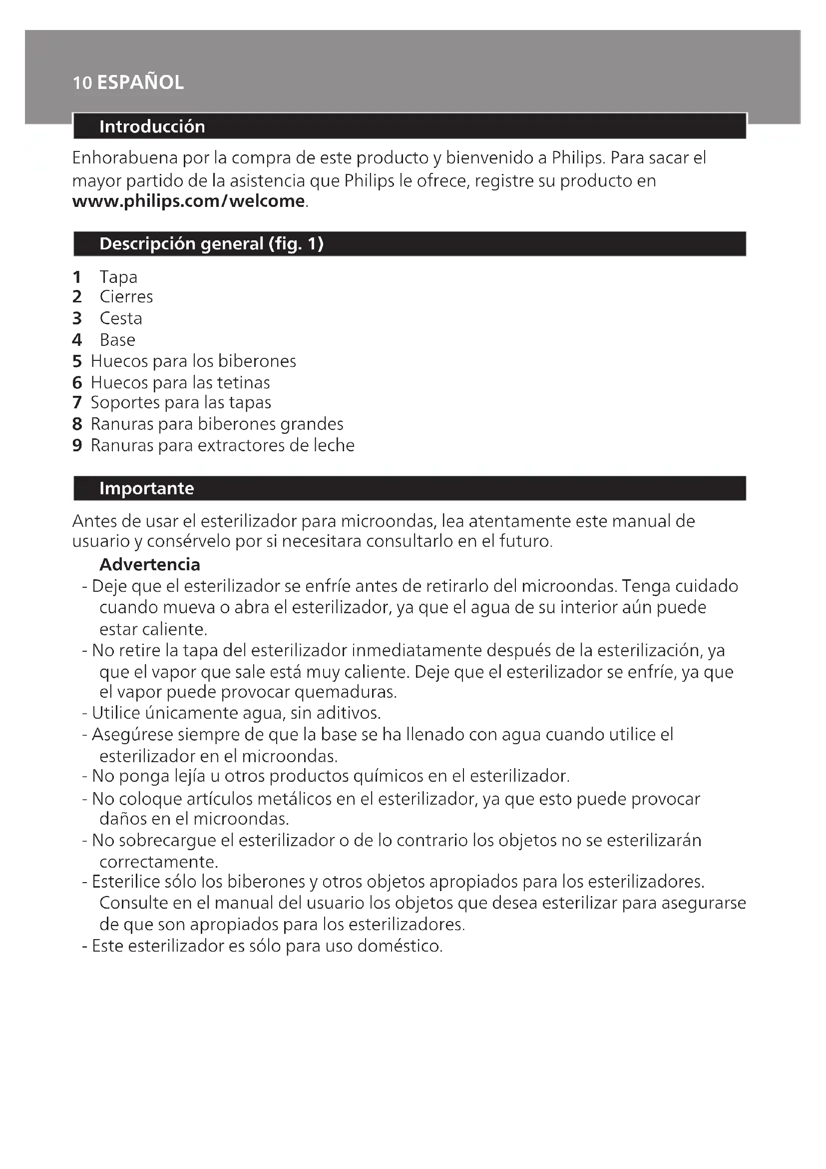 485ENGLISH Introduction Congratulations on your purchase and welcome to Philips! To fully benet from the support that Philips oers, register your product at www.philips.com/welcome. General description (Fig. 1) 1 Lid 2 Clips 3 Basket 4 Base 5 Bottle cavities 6 Teat cavities 7 Dome cap holders 8 Slots for large bottles 9 Slots for breast pumps Important Read this user manual carefully before you use the microwave steriliser and save it for future reference. Warning - Let the steriliser cool down before you remove it from the microwave. Be careful when you move or open the steriliser, because the water in it can still be hot. - Do not remove the lid from the steriliser immediately after sterilising, as the steam that comes out is very hot. Let the steriliser cool down, as steam can cause burns. - Only use water without any additives. - Always make sure that the base is lled with water when you use the steriliser in the microwave. - Do not put bleach or other chemicals in the steriliser. - Do not place metal items in the steriliser, as this may cause damage to the microwave. - Do not overload the steriliser, otherwise the items are not sterilised properly. - Only sterilise baby bottles and other items that are suitable for sterilisers. Check the user manual of the items you want to sterilise, to make sure they are suitable for sterilisers. - This steriliser is intended for household use only.6 ENGLISH Caution - Children should be supervised to ensure that they do not play with the steriliser. - Always make sure the base is lled with 200ml water before you start sterilising. - After each use, pour any remaining water out of the steriliser after the water has cooled down. - Always let the steriliser cool down before you store it. - Always wash your hands before you touch the sterilised items. - Do not expose the steriliser to extreme heat or direct sunlight. - Do not place the steriliser on a hot surface. - If you use a combination oven (with grill function), make sure that the oven or grill is switched o and has cooled down before you put the steriliser in it. Before rst use Before you use the steriliser for the rst time, clean it thoroughly as described below. 1 Remove the basket from the base. 2 Fill a baby bottle or a measuring cup with exactly 200ml tap water and pour this into the base (Fig. 2). The amount of water needs to be exactly 200ml. When the base contains too much water, the items will not be sterilised properly. When the base does not contain enough water, this can cause damage to the steriliser or microwave. 3 Place the basket in the base (Fig. 3). 4 Put the lid on the steriliser (1) and push down the clips to lock the lid into place (2). (Fig. 4) 5 Place the steriliser in the microwave. (Fig. 5) Note: Make sure that the microwave is clean and dry before you start sterilising. Note: If you have a combination oven, make sure that the oven or grill is switched o and has cooled down before you put the steriliser in it. 6 Select the appropriate microwave wattage and time (see the table in chapter ‘Using the microwave steriliser’) and let the microwave operate. 7 After the microwave has nished, open it and let the steriliser cool down before you remove it from the microwave. 8 Pull open the clips (1) and remove the lid (2) (Fig. 6). 9 Pour out the remaining water and rinse the base and basket thoroughly.7ENGLISH Preparing for use Filling the basket Before you put the items to be sterilised in the basket, clean them thoroughly in the dishwasher or clean them by hand with hot water and some washing-up liquid. Make sure you remove all milk residues. Note: Make sure all items to be sterilised are completely disassembled and place them in the basket with their openings pointing downwards, to prevent them from lling with water. Note: Do not stack the items too closely together. The steam has to be able to circulate around the items to ensure eective sterilisation. There are several ways to ll the basket: Four Philips AVENT feeding bottles 1 Place the bottles upside down in the bottle cavities. (Fig. 7) 2 Place the teats in the teat cavities (Fig. 8). 3 Place the screw rings loosely on top of the teats (Fig. 9). Note: Larger screw rings only t if placed in slanted position over the teats. 4 Place the dome caps in the dome cap holders (Fig. 10). Two large Philips AVENT feeding bottles (330ml/11oz) 1 Insert the rim of the bottles into the slots for large bottles (Fig. 11). 2 Place the teats in the teat cavities (Fig. 12). 3 Place the screw rings loosely on top of the teats (Fig. 13). Note: Larger screw rings only t if placed in slanted position over the teats. 4 Place the dome caps in the dome cap holders (Fig. 14). Four Philips AVENT storage cups and lids 1 Place the storage cups upside down in the basket (Fig. 15). 2 Place the lids vertically around the bottles. (Fig. 16) Two Philips AVENT breast pumps and two Philips AVENT feeding bottles Do not place the electrical parts in the steriliser. 1 Fully disassemble the breast pump. 2 Insert the rim of the pump body in the breast pump slots in the bottom of the basket (Fig. 17). 3 Place the bottles upside down in the bottle cavities (Fig. 18). 4 Place the remaining non-electrical parts of the breast pump in any unobstructed space in the basket (Fig. 19). Note: Make sure steam can circulate around these parts.8 ENGLISH Using the microwave steriliser Only place items in the steriliser that are suitable for sterilising. Do not sterilise your bottle brush or items that are lled with liquid, e.g. teethers lled with cooling uid. Note: Before you sterilise bottles and other items, clean them rst. 1 Remove the basket from the base. 2 Fill a baby bottle or measuring cup with exactly 200ml tap water and pour this into the base (Fig. 2). The amount of water needs to be exactly 200ml. When the base contains too much water, the items will not be sterilised properly. When the base does not contain enough water, this can cause damage to the steriliser o