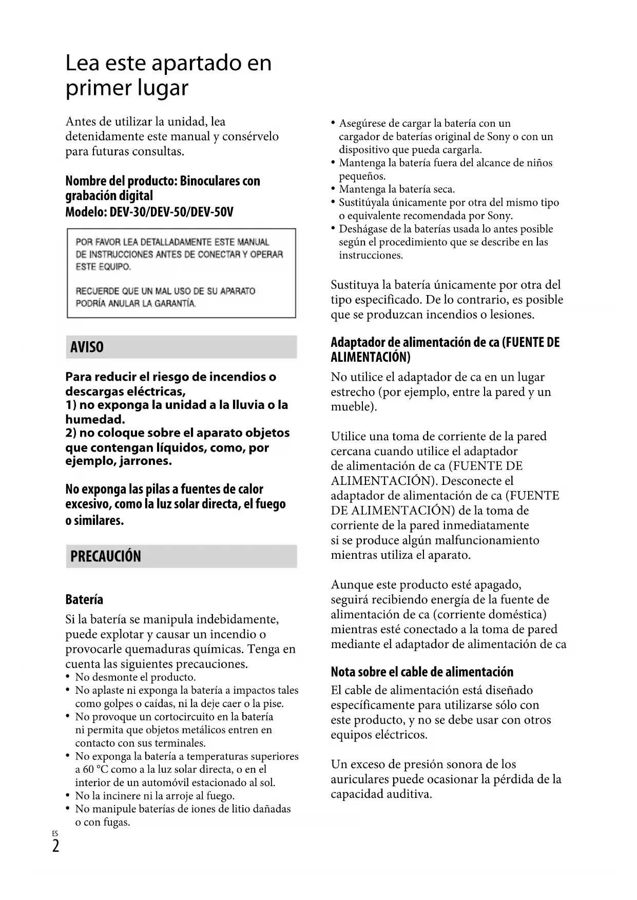 Lea este apartado en primer lugar Antes de utilizar la unidad, lea detenidamente este manual y consérvelo para futuras consultas. Nombre del producto: Binoculares con grabación digital Modelo: DEV-30/DEV-50/DEV-50V AVISO Para reducir el riesgo de incendios o descargas eléctricas,