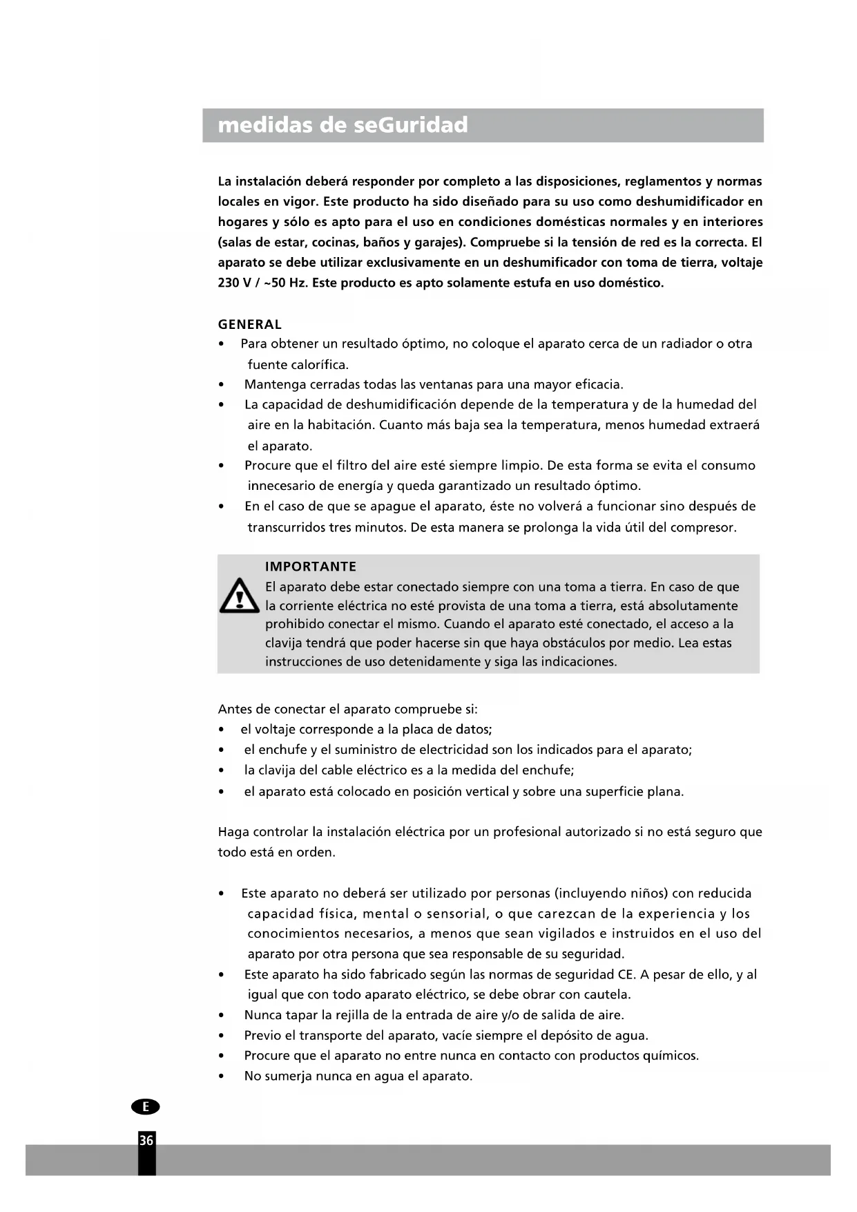 medidas de seGuridad La instalación deberá responder por completo a las disposiciones, reglamentos y normas locales en vigor. Este producto ha sido diseñado para su uso como deshumidificador en hogares y sólo es apto para el uso en condiciones domésticas normales y en interiores (salas de estar, cocinas, baños y garajes). Compruebe si la tensión de red es la correcta. El aparato se debe utilizar exclusivamente en un deshumificador con toma de tierra, voltaje 230 V / ~50 Hz. Este producto es apto solamente estufa en uso doméstico. GENERAL