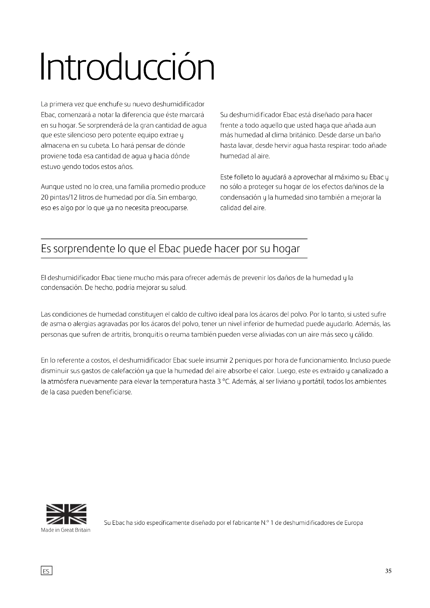 Verzoek om service Voor service of nadere informatie kunt u contact opnemen met de dichtstbijzijnde Ebac-vestiging of detailhandelaar. Ebac Limted Ketton Way Aycliffe Business Park Newton Aycliffe County Durham Verenigd Koninkrijk DL5 6SQ Tel: 0845 634 1392 (GB)35 El deshumidificador Ebac tiene mucho más para ofrecer además de prevenir los daños de la humedad y la condensación. De hecho, podría mejorar su salud. Las condiciones de humedad constituyen el caldo de cultivo ideal para los ácaros del polvo. Por lo tanto, si usted sufre de asma o alergias agravadas por los ácaros del polvo, tener un nivel inferior de humedad puede ayudarlo. Además, las personas que sufren de artritis, bronquitis o reuma también pueden verse aliviadas con un aire más seco y cálido. En lo referente a costos, el deshumidificador Ebac suele insumir 2 peniques por hora de funcionamiento. Incluso puede disminuir sus gastos de calefacción ya que la humedad del aire absorbe el calor. Luego, este es extraído y canalizado a la atmósfera nuevamente para elevar la temperatura hasta 3 °C. Además, al ser liviano y portátil, todos los ambientes de la casa pueden beneficiarse. La primera vez que enchufe su nuevo deshumidificador Ebac, comenzará a notar la diferencia que éste marcará en su hogar. Se sorprenderá de la gran cantidad de agua que este silencioso pero potente equipo extrae y almacena en su cubeta. Lo hará pensar de dónde proviene toda esa cantidad de agua y hacia dónde estuvo yendo todos estos años. Aunque usted no lo crea, una familia promedio produce 20 pintas/12 litros de humedad por día. Sin embargo, eso es algo por lo que ya no necesita preocuparse. Su deshumidificador Ebac está diseñado para hacer frente a todo aquello que usted haga que añada aun más humedad al clima británico. Desde darse un baño hasta lavar, desde hervir agua hasta respirar: todo añade humedad al aire. Este folleto lo ayudará a aprovechar al máximo su Ebac y no sólo a proteger su hogar de los efectos dañinos de la condensación y la humedad sino también a mejorar la calidad del aire. Introducción