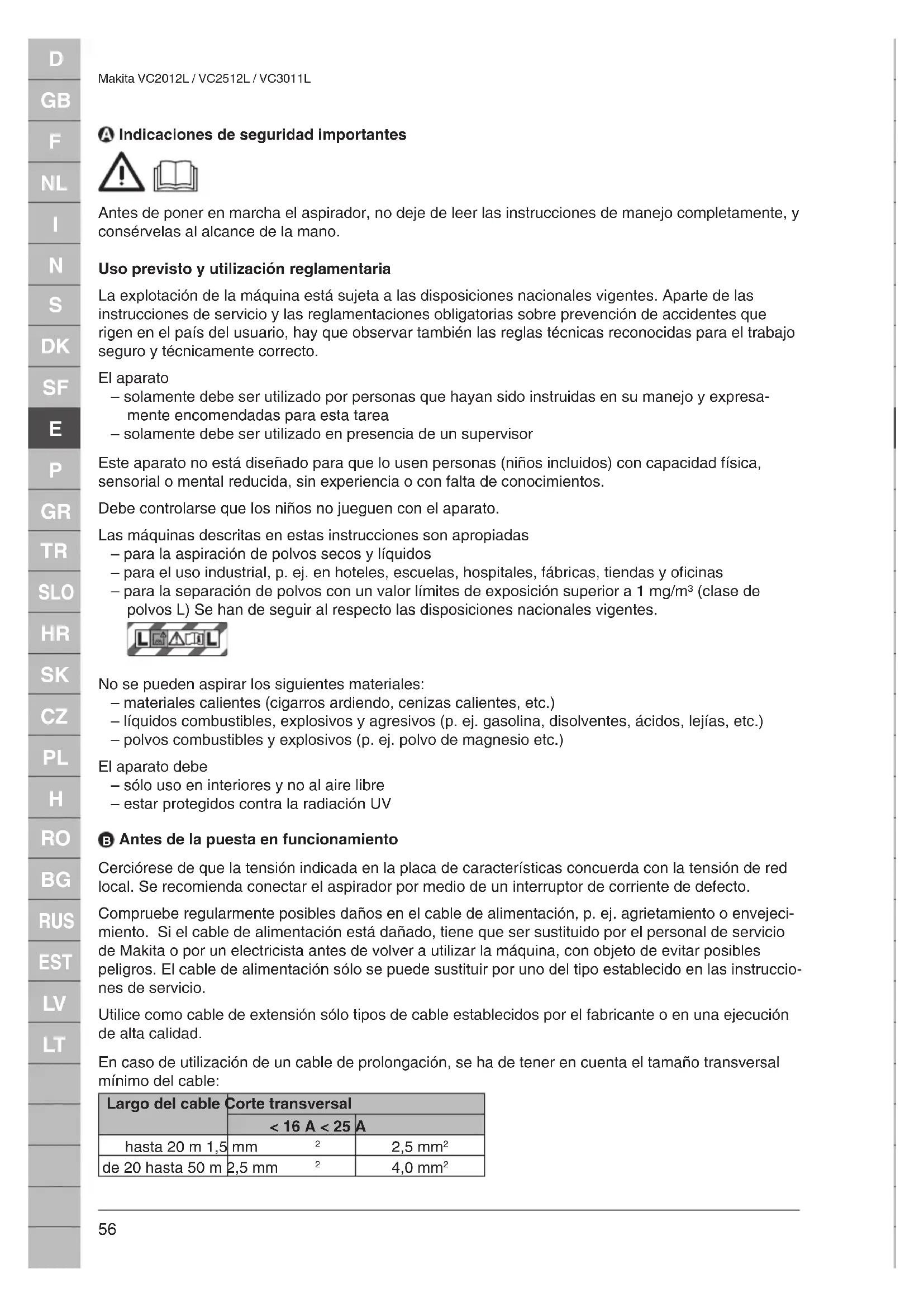 Antes de la puesta en funcionamiento Cerciórese de que la tensión indicada en la placa de características concuerda con la tensión de red local. Se recomienda conectar el aspirador por medio de un interruptor de corriente de defecto. Compruebe regularmente posibles daños en el cable de alimentación, p. ej. agrietamiento o envejeci- miento. Si el cable de alimentación está dañado, tiene que ser sustituido por el personal de servicio de Makita o por un electricista antes de volver a utilizar la máquina, con objeto de evitar posibles peligros. El cable de alimentación sólo se puede sustituir por uno del tipo establecido en las instruccio- nes de servicio. Utilice como cable de extensión sólo tipos de cable establecidos por el fabricante o en una ejecución de alta calidad. En caso de utilización de un cable de prolongación, se ha de tener en cuenta el tamaño transversal mínimo del cable: Largo del cable Corte transversal < 16 A < 25 A hasta 20 m 1,5 mm