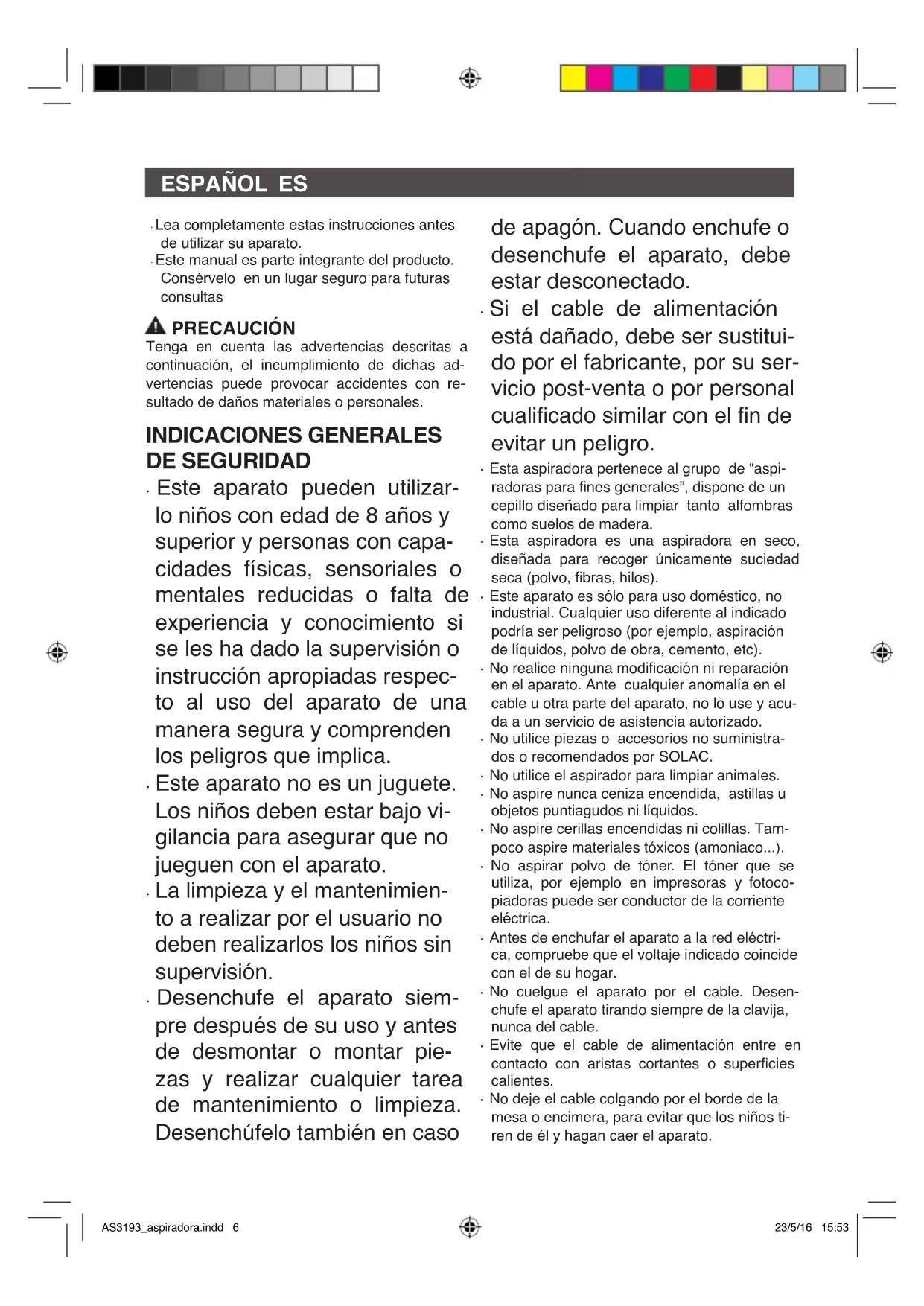 - No deje el cable colgando por el borde de la mesa o encimera, para evitar que los niños ti- ren de él y hagan caer el aparato. AS3193_aspiradora.indd 6 23/5/16 15:53ES