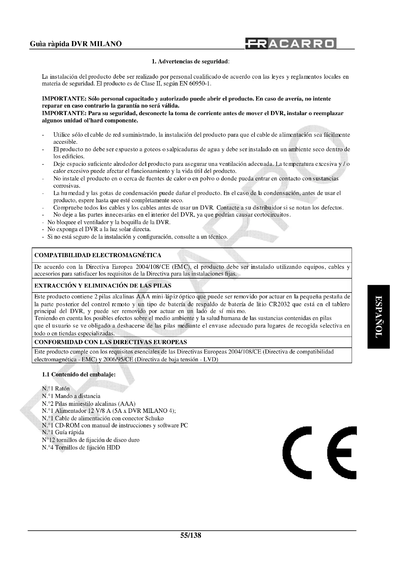 De acuerdo con la Directiva Europea 2004/108/CE (EMC), el producto debe ser instalado utilizando equipos, cables y accesorios para satisfacer los requisitos de la Directiva para las instalaciones fijas. EXTRACCIÓN Y ELIMINACIÓN DE LAS PILAS Este producto contiene 2 pilas alcalinas AAA mini-lápiz óptico que puede ser removido por actuar en la pequeña pestaña de la parte posterior del control remoto y un tipo de batería de respaldo de batería de litio CR2032 que está en el tablero principal del DVR, y puede ser removido por actuar en un lado de sí mis mo. Teniendo en cuenta los posibles efectos sobre el medio ambiente y la salud humana de las sustancias contenidas en pilas que el usuario se ve obligado a deshacerse de las pilas mediante el envase adecuado para lugares de recogida selectiva en todo o en tiendas especializadas.