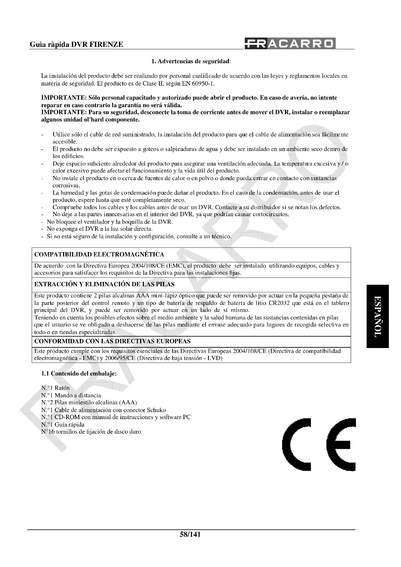 De acuerdo con la Directiva Europea 2004/108/CE (EMC), el producto debe ser instalado utilizando equipos, cables y accesorios para satisfacer los requisitos de la Directiva para las instalaciones fijas. EXTRACCIÓN Y ELIMINACIÓN DE LAS PILAS Este producto contiene 2 pilas alcalinas AAA mini-lápiz óptico que puede ser removido por actuar en la pequeña pestaña de la parte posterior del control remoto y un tipo de batería de respaldo de batería de litio CR2032 que está en el tablero principal del DVR, y puede ser removido por actuar en un lado de sí mismo.