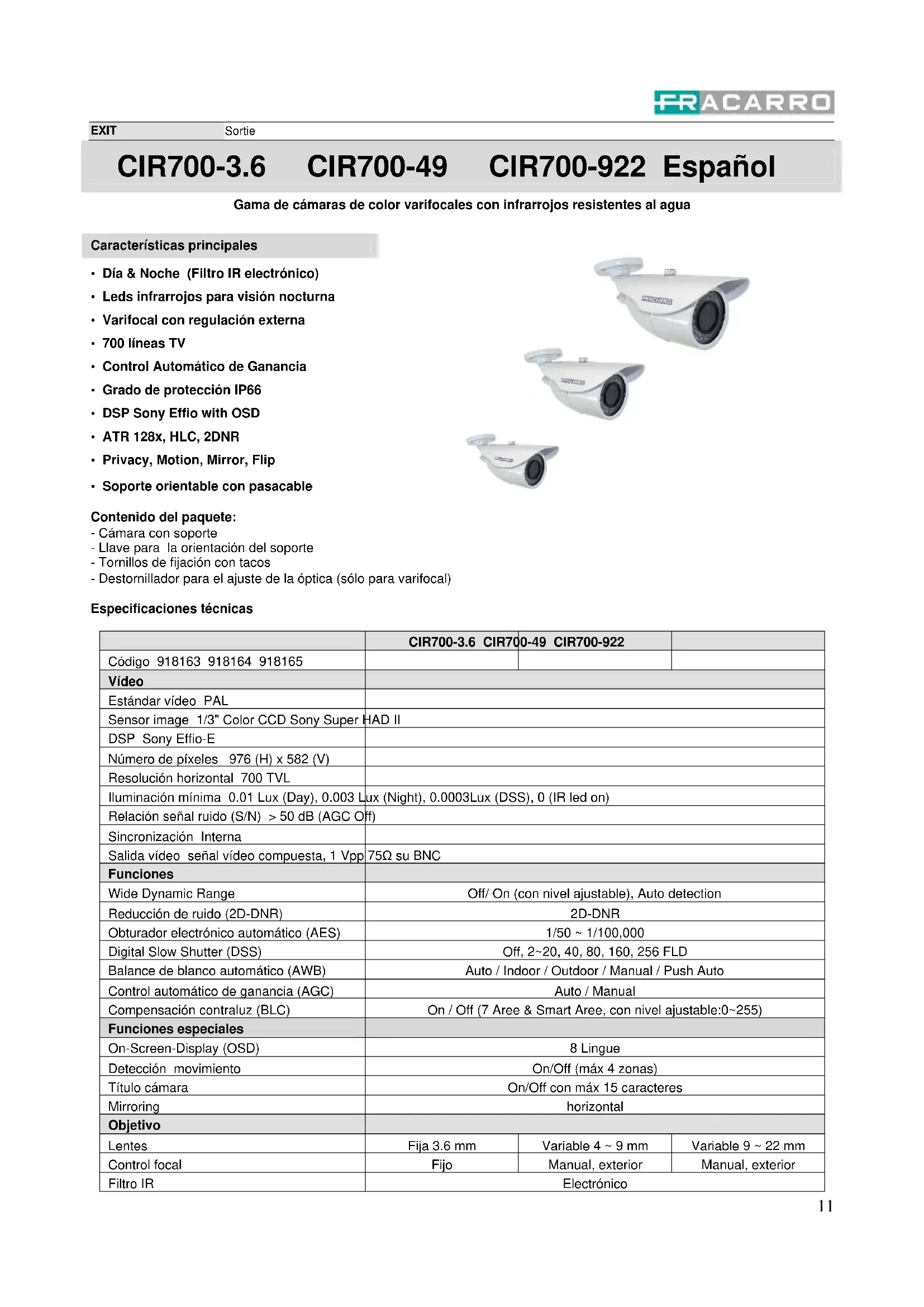 EXIT Sortie CIR700-3.6 CIR700-49 CIR700-922 Español Gama de cámaras de color varifocales con infrarrojos resistentes al agua Características principales