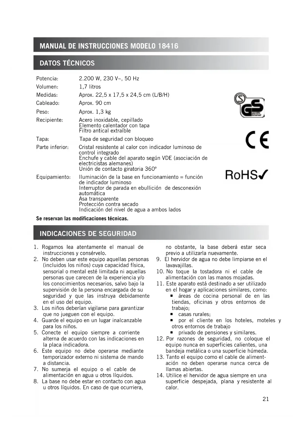 superficie despejada, plana y resistente al calor. Potencia: 2.200 W, 230 V~, 50 Hz Volumen: 1,7 litros Medidas: Aprox. 22,5 x 17,5 x 24,5 cm (L/B/H) Cableado: Aprox. 90 cm Peso: Aprox. 1,3 kg Recipiente: Acero inoxidable, cepillado Elemento calentador con tapa Filtro antical extraíble Tapa: Tapa de seguridad con bloqueo Parte inferior: Cristal resistente al calor con indicador luminoso de control integrado Enchufe y cable del aparato según VDE (asociación de electricistas alemanes) Unión de contacto giratoria 360º Equipamiento: Iluminación de la base en funcionamiento = función de indicador luminoso Interruptor de parada en ebullición de desconexión automática Asa transparente Protección contra secado Indicación del nivel de agua a ambos lados Se reservan las modificaciones técnicas.2222 El fabricante no asume responsabilidad en el caso de manejo inadecuado o erróneo, o después de la realización de reparaciones mediante talleres o personas no autorizadas. PueSta en marcha y utilización