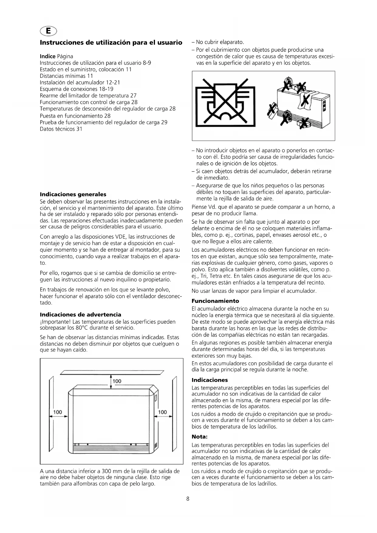 ● De zekering van de laadregeling in de meterkast contro- leren en eventueel vervangen of opnieuw inschakelen. Springt de zekering er weer uit, dan moet de installateur op de hoogte worden gesteld. ● De kamertemperatuur is verkeerd ingesteld (zie punt 1) ● De regeling is verkeerd ingesteld (zie punt 1) volle oplading geen oplading8 Instrucciones de utilización para el usuario Indice Página Instrucciones de utilización para el usuario 8-9 Estado en el suministro, colocación 11 Distancias mínimas 11 Instalación del acumulador 12-21 Esquema de conexiones 18-19 Rearme del limitador de temperatura 27 Funcionamiento con control de carga 28 Temperaturas de desconexión del regulador de carga 28 Puesta en funcionamiento 28 Prueba de funcionamiento del regulador de carga 29 Datos técnicos 31 Indicaciones generales Se deben observar las presentes instrucciones en la instala- ción, el servicio y el mantenimiento del aparato. Este último ha de ser instalado y reparado sólo por personas entendi- das. Las reparaciones efectuadas inadecuadamente pueden ser causa de peligros considerables para el usuario. Con arreglo a las disposiciones VDE, las instrucciones de montaje y de servicio han de estar a disposición en cual- quier momento y se han de entregar al montador, para su conocimiento, cuando vaya a realizar trabajos en el apara- to. Por ello, rogamos que si se cambia de domicilio se entre- guen las instrucciones al nuevo inquilino o propietario. En trabajos de renovación en los que se levante polvo, hacer funcionar el aparato sólo con el ventilador desconec- tado. Indicaciones de advertencia ¡Importante! Las temperaturas de las superficies pueden sobrepasar los 80°C durante el servicio. Se han de observar las distancias mínimas indicadas. Estas distancias no deben disminuir por objetos que cuelguen o que se hayan caído. A una distancia inferior a 300 mm de la rejilla de salida de aire no debe haber objetos de ninguna clase. Esto rige también para alfombras con capa de pelo largo. – No cubrir elaparato. – Por el cubrimiento con objetos puede producirse una congestión de calor que es causa de temperaturas excesi- vas en la superficie del aparato y en los objetos. – No introducir objetos en el aparato o ponerlos en contac- to con él. Esto podría ser causa de irregularidades funcio- nales o de ignición de los objetos. – Si caen objetos detrás del acumulador, deberán retirarse de inmediato. – Asegurarse de que los niños pequeños o las personas débiles no toquen las superficies del aparato, particular- mente la rejilla de salida de aire. Piense Vd. que el aparato se puede comparar a un horno, a pesar de no producir llama. Se ha de observar sin falta que junto al aparato o por delante o encima de él no se coloquen materiales inflama- bles, como p. ej., cortinas, papel, envases aerosol etc., o que no llegue a ellos aire caliente. Los acumuladores eléctricos no deben funcionar en recin- tos en que existan, aunque sólo sea temporalmente, mate- rias explosivas de cualquier género, como gases, vapores o polvo. Esto aplica también a disolventes volátiles, como p. ej., Tri, Tetra etc. En tales casos asegurarse de que los acu- muladores están enfriados a la temperatura del recinto. No usar lanzas de vapor para limpiar el acumulador. Funcionamiento El acumulador eléctrico almacena durante la noche en su núcleo la energía térmica que se necesitará al día siguiente. De este modo se puede aprovechar la energía eléctrica más barata durante las horas en las que las redes de distribu- ción de las compañías eléctricas no están tan recargadas. En algunas regiones es posible también almacenar energía durante determinadas horas del día, si las temperaturas exteriores son muy bajas. En estos acumuladores con posibilidad de carga durante el día la carga principal se regula durante la noche. Indicaciones Las temperaturas perceptibles en todas las superficies del acumulador no son indicativas de la cantidad de calor almacenado en la misma, de manera especial por las dife- rentes potencias de los aparatos. Los ruidos a modo de crujido o crepitanción que se produ- cen a veces durante el funcionamiento se deben a los cam- bios de temperatura de los ladrillos. Nota: Las temperaturas perceptibles en todas las superficies del acumulador no son indicativas de la cantidad de calor almacenado en la misma, de manera especial por las dife- rentes potencias de los aparatos. Los ruidos a modo de crujido o crepitanción que se produ- cen a veces durante el funcionamiento se deben a los cam- bios de temperatura de los ladrillos.