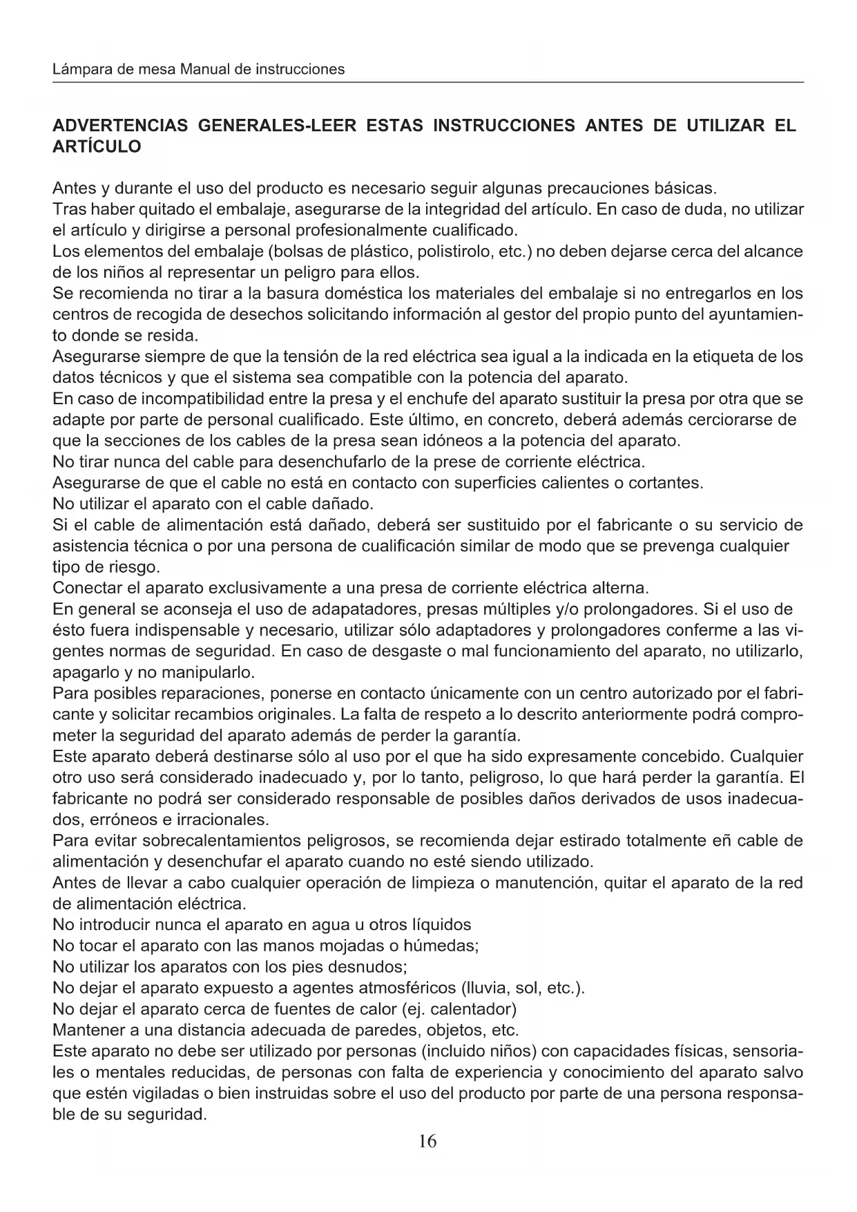 ADVERTENCIAS GENERALES-LEER ESTAS INSTRUCCIONES ANTES DE UTILizar EL ARTICULO