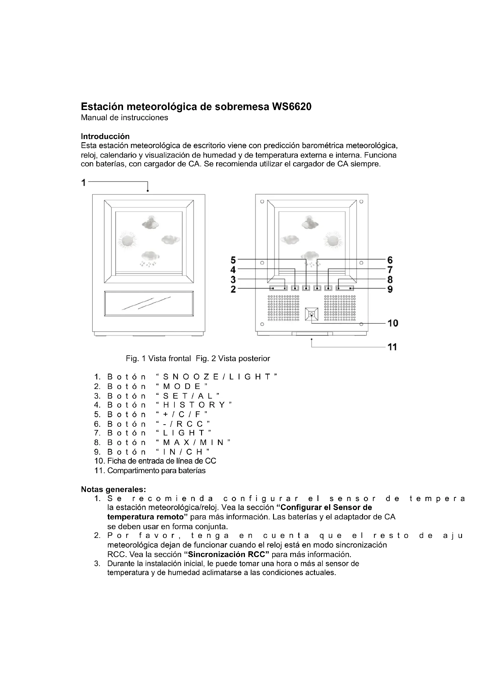 - Se possibile, riciclarla. Specifiche tecniche Intervallo di temperatura interno: 0°C a 50°C (32°F a 122°F) Intervallo di temperatura esterno: -20°C a 50°C (-4°F a 122°F) Intervallo umidità relativa: 20%-95%Intervallo pressione barometrica: 930mb a 1050mb Alimentazione (Stazione meteorológica): 4 batterie AAA, 1,5V Alimentazione (Sensore della temperatura): 2 batterie AAA, 1,5VEstación meteorológica de sobremesa WS6620 Manual de instrucciones Introducción Esta estación meteorológica de escritorio viene con predicción barométrica meteorológica, reloj, calendario y visualización de humedad y de temperatura externa e interna. Funciona con baterías, con cargador de CA. Se recomienda utilizar el cargador de CA siempre.
